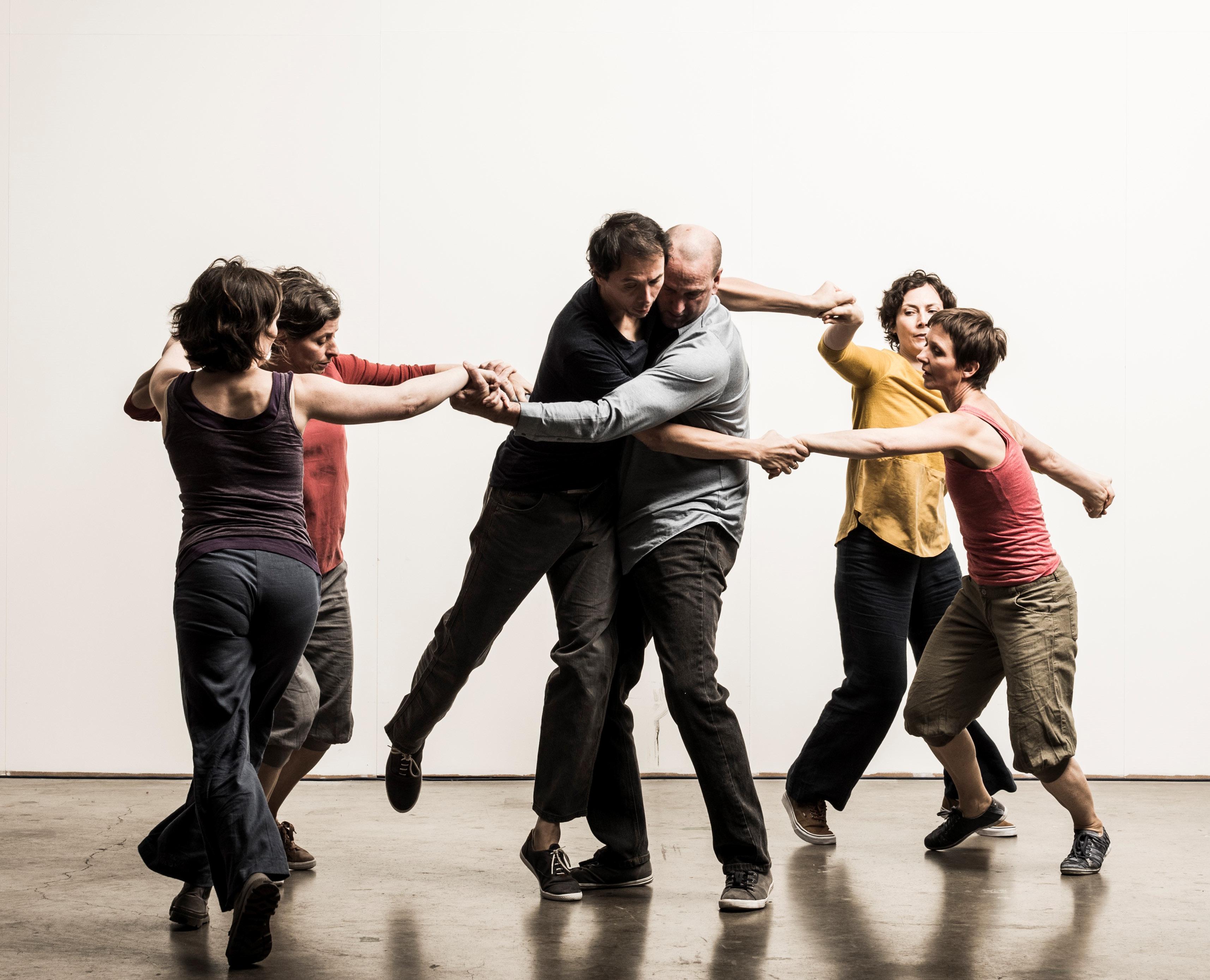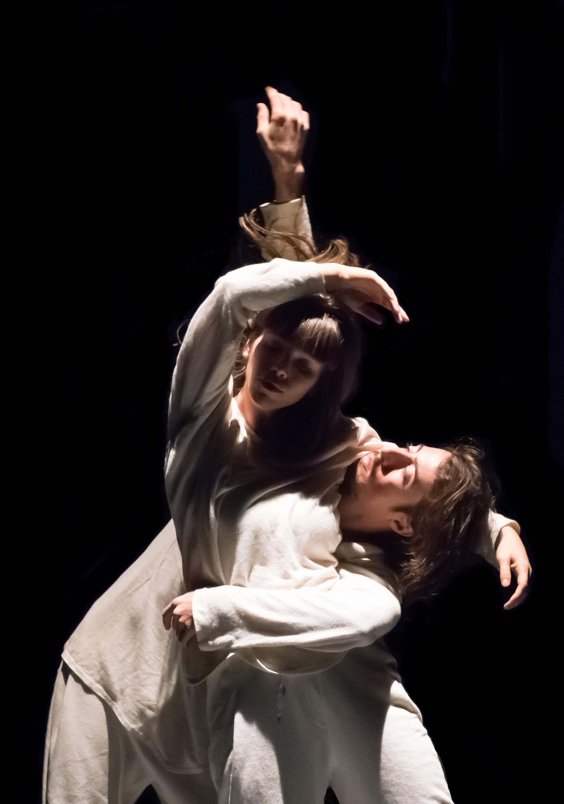 Two dancers reach upward and around one another in ‘Syncing Feeling’ - Photo Credit: Ashley McLellan