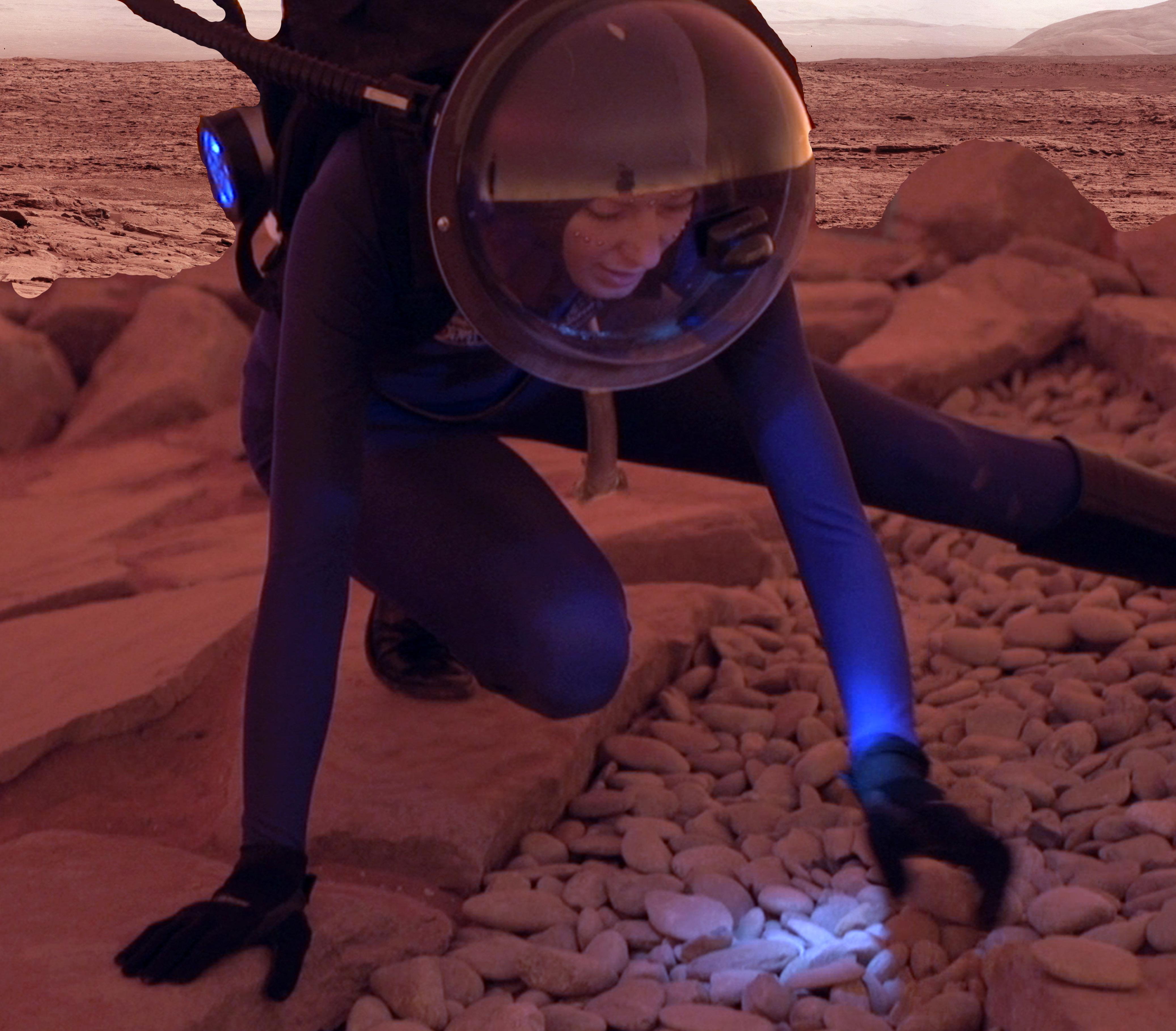 Sarah Jane Pell crouches and examines rocks in stills from We Are All Explorer Fish Sarah Jane Pell, Site Reconnaissance VSSEC Mars Simulation, AU. - Photo Credit: Richard Byrne, 2013