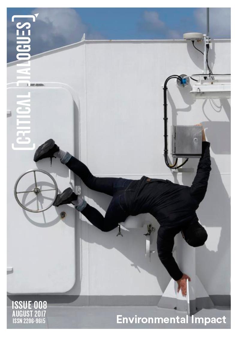 Working alongside the wonderful Liz Lea to co-edit the 8th edition of Critical Dialogues has been deeply rewarding and intellectually stimulating. Together, we have selected seven artists with a broad range of experience and insight into the Environmental Impact of creating work in a variety of ways and conditions. Each of the articles speaks for itself with rich and compelling glimpses into the thinking processes and methodologies of these extraordinary creatives. Lindy, Gene, Vicky, James, Dean, Sarah Jane and Jade have been immensely generous and open throughout the process and I would like to thank each of you for your stunning contributions.