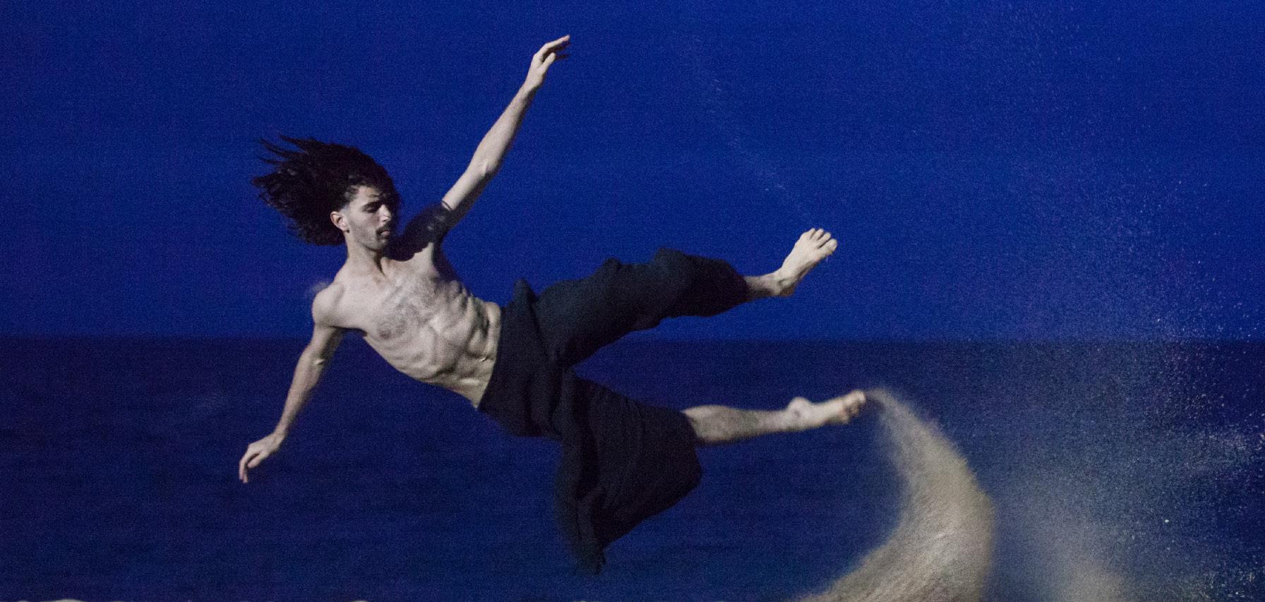 A dancer jumping sideways on a beach - Photo Credit: Amber Haines