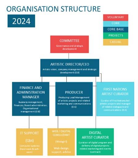 Dylan Goh took up the role of Producer (0.6) handed over from Ira Ferris in July 2024. Ira handed over her resignation to pursue her artistic practice both overseas and in Australia. Dylan Goh joined for six months and left in December 2024 to pursue his independent producing activities alongside other employment. Lizzie Thomson was appointed as acting producer (0.8) for a start in January 2025 as part of the new staff structure (increased hours and wages for the position).