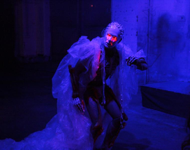A human-like figure with bright red eyes hunches over with one arm-raised. | Carrion | Image by Performance Space