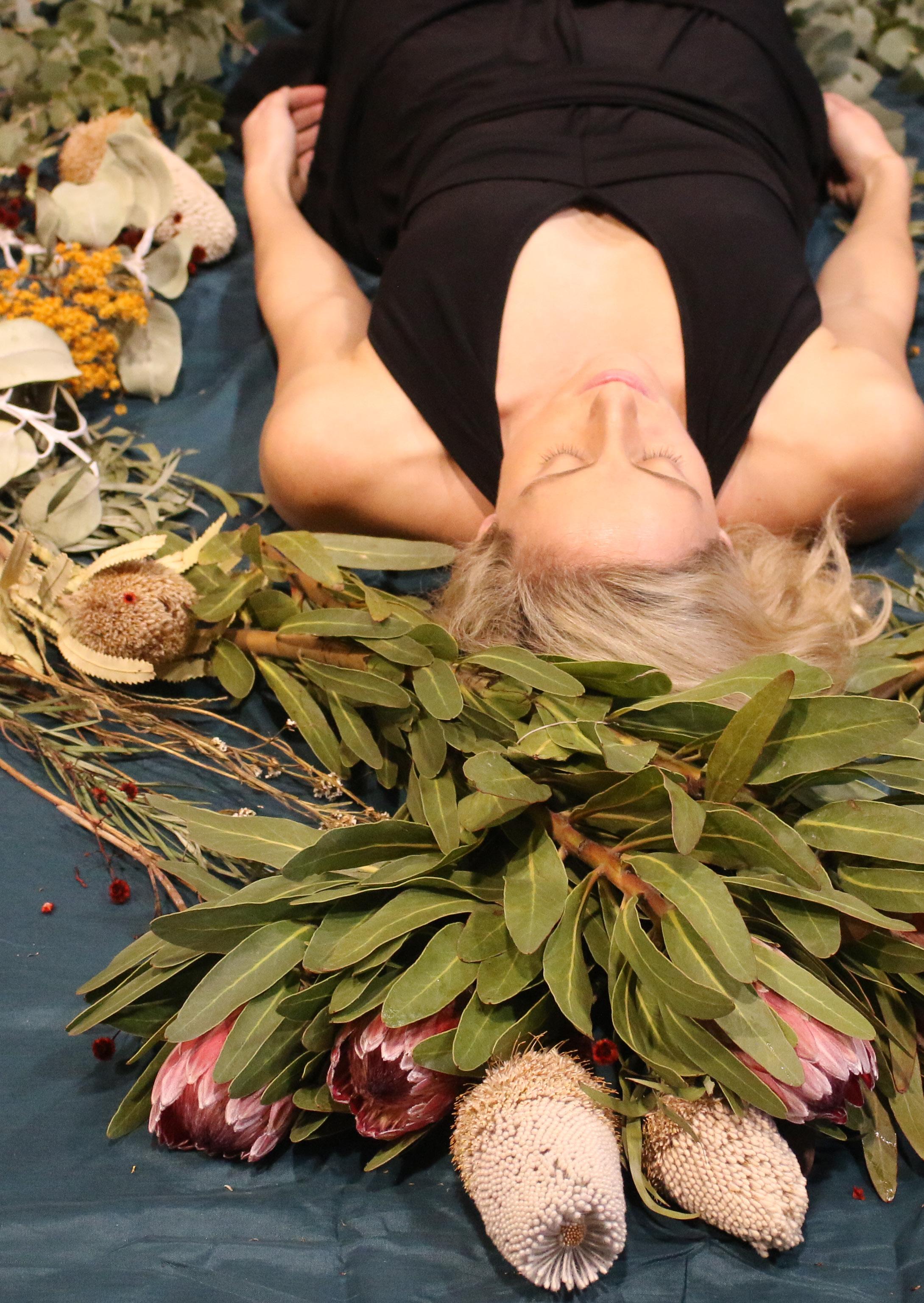Cover Image: Briana Kell lies on the ground with flowers beside her head. | Research Development Lab | Image by Sarah