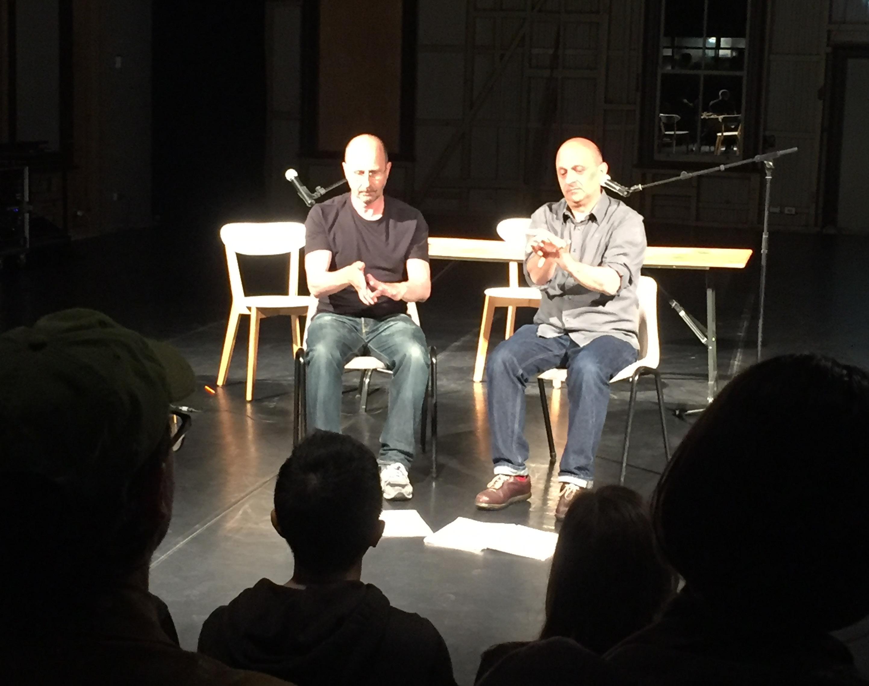 Jonanthan and Matteo, sitting, perform for an audience. | Presentation: Sitting Duet and Body Not Fit For Purpose | Image by Bibi Serafim