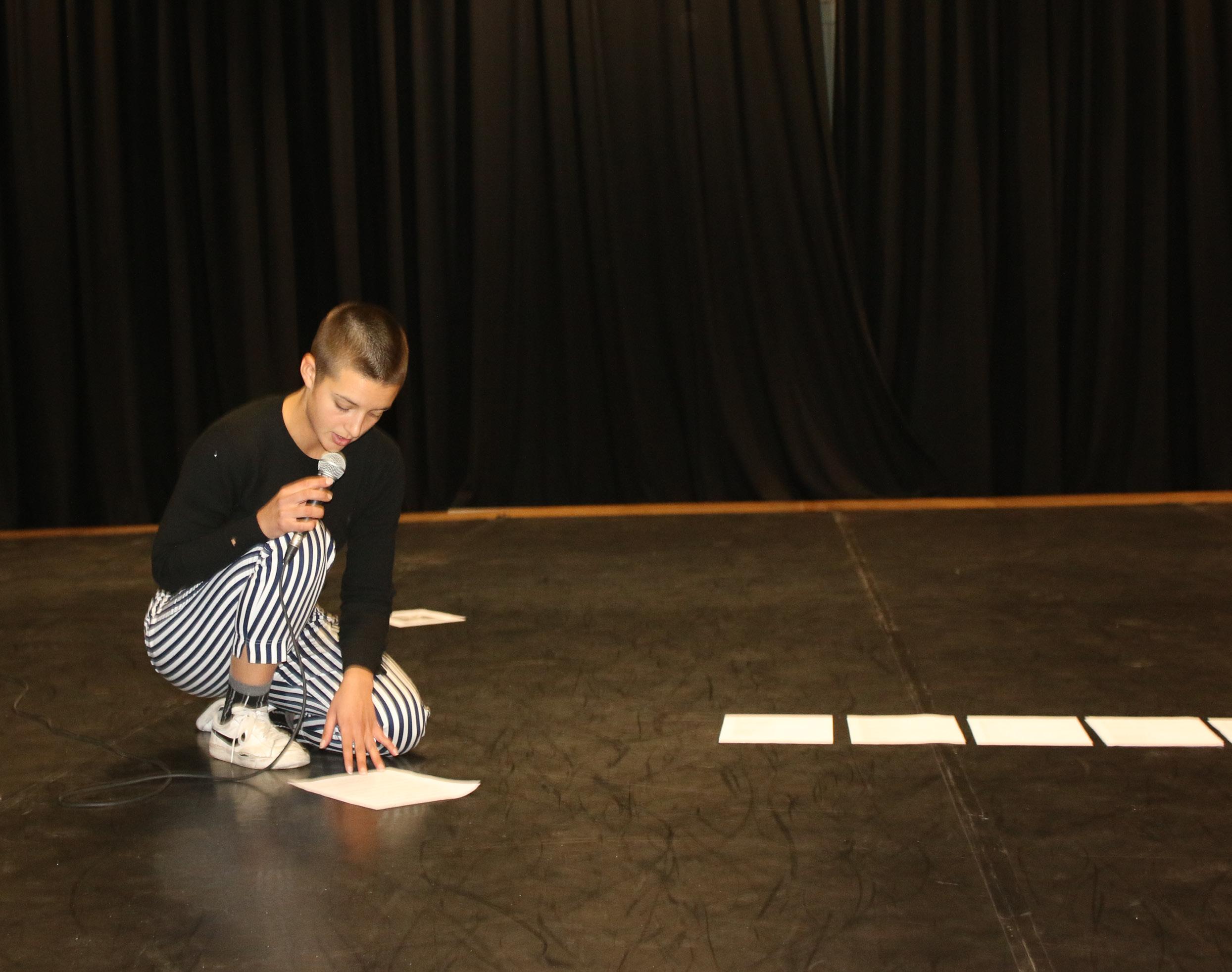 Ivey Wawn crouches, speaking into a microphone. | Labs and Workshops | Image by Margie Breen