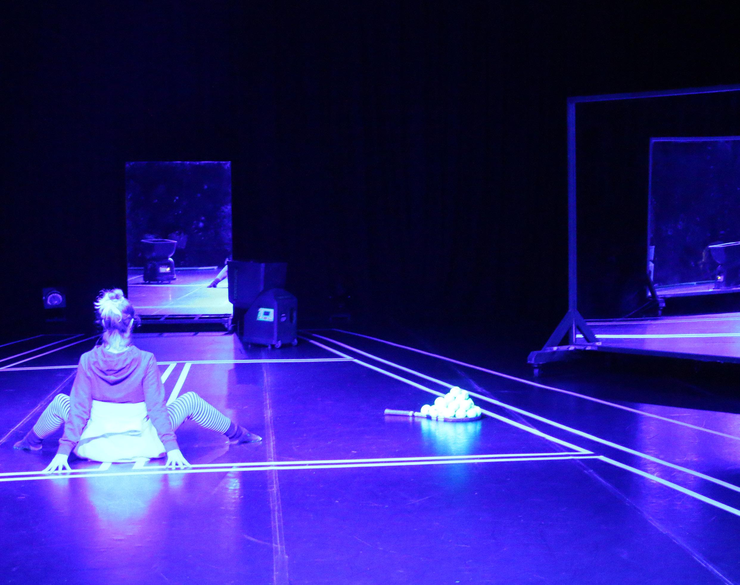 Ready Steady Studio (Hana Miller and Jacob Perkins) to collaborate on a choreographic experiment that used a collection of programmed tennis ball machines. She utilised principles of game theory to structure the movements of the dancer, the machines and their relationship to one another and explore