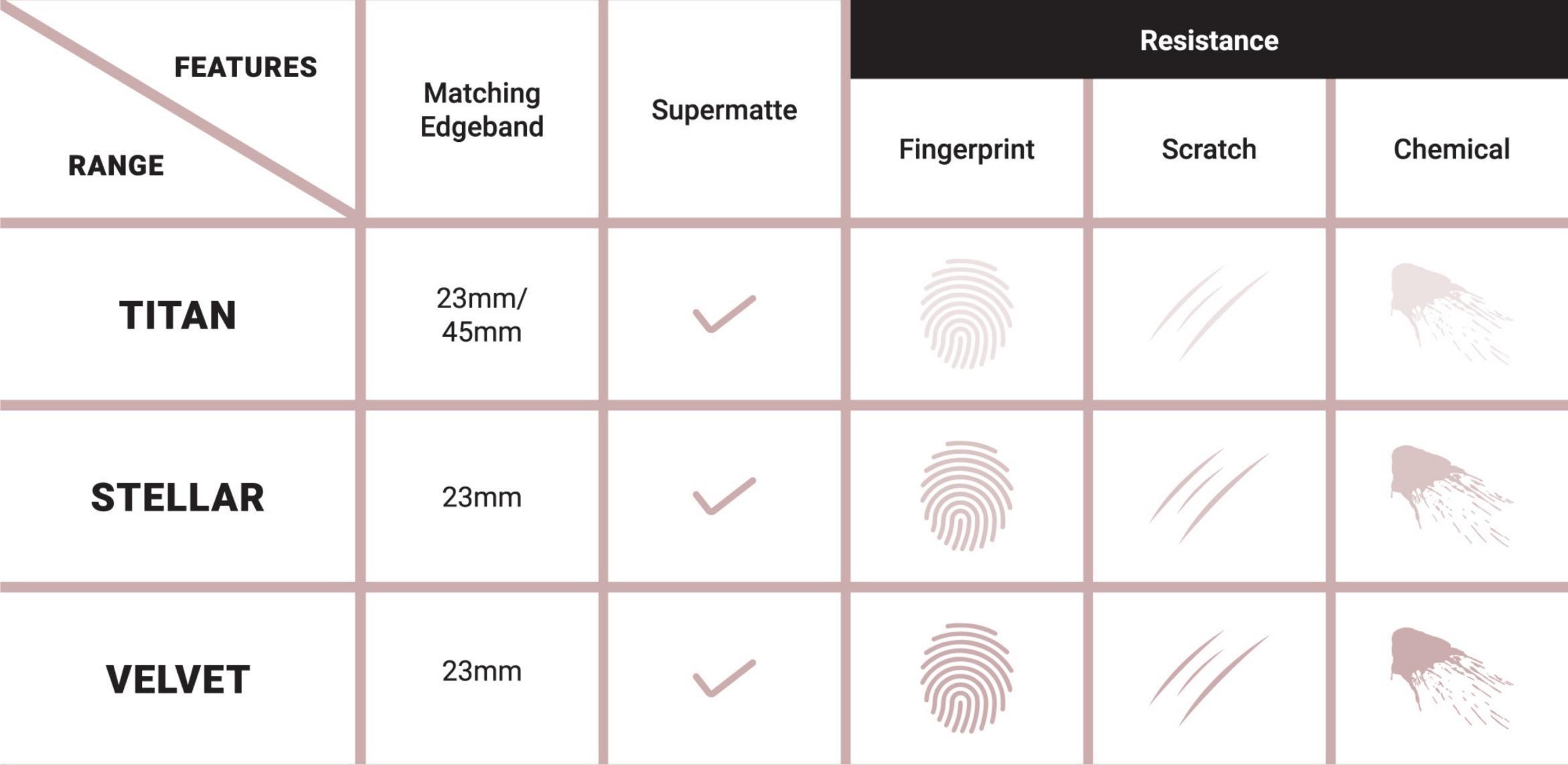 TITAN’s technologically advanced surface is imbued with outstanding properties including anti-fingerprint, high scratch resistance, high chemical resistance, light fastness, and zero bacterial proliferation.