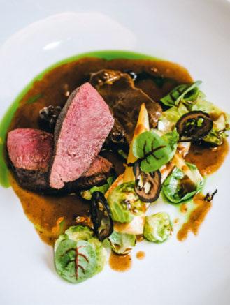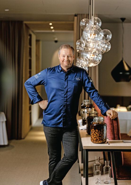 serviert in einem von Fisch und Pilzen dominierten Fond. Ein echtes Geduldspiel für Pinzettenkünstler ist das kreisrunde Anrichten von kleinen gegarten Artischockenröllchen, die mit Wiener Schneckenfeisch eine wunderbare Koexistenz eingehen. Die glasige, an der Hautseite fantastisch knusprige Lachsforelle liegt in einer großartigen Café-de-Paris-Sauce, in der Estragon für erfrischende Säure sorgt. Dass das Arrangement in der rechteckigen Aussparung eines Holztellers stattfndet, gibt einen zusätzlichen Reiz. Im tiefen runden Teller dann der Räucheraal in einer denkwürdig intensiven, gehaltvollen Sauce aus Mangalitza und Gänseleber. Ein Gericht, das mit einem Glas Phincas, einer Tempranillo-Cuvée aus dem Rioja, den stimmigen Widerpart fndet. Bei der Gelegen-