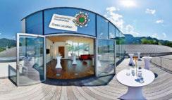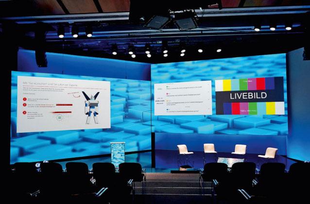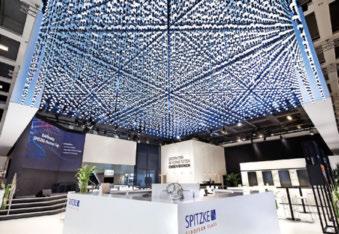 brillantes Lichtszenario in verschiedensten Farbverläufen über der großen Empfangstheke ins Auge. Die Aufmerksamkeit der Messebesucher wurde so bereits aus großer räumlicher Distanz zum Stand gewonnen. Auf der geräumigen Bühne fanden während der Messe Vorträge, Talkrunden sowie hochkarätig besetzte Podiumsdiskussionen statt, die von thematisch passenden Medien-Inhalten auf einer großen LED-Wand umrahmt wurden. Die modern eingerichtete Lounge, ein topausgestatteter Meetingraum und das Setup der frei zugänglichen MeetingArea boten Raum für erfolgreiche Kunden- und Austauschgespräche.