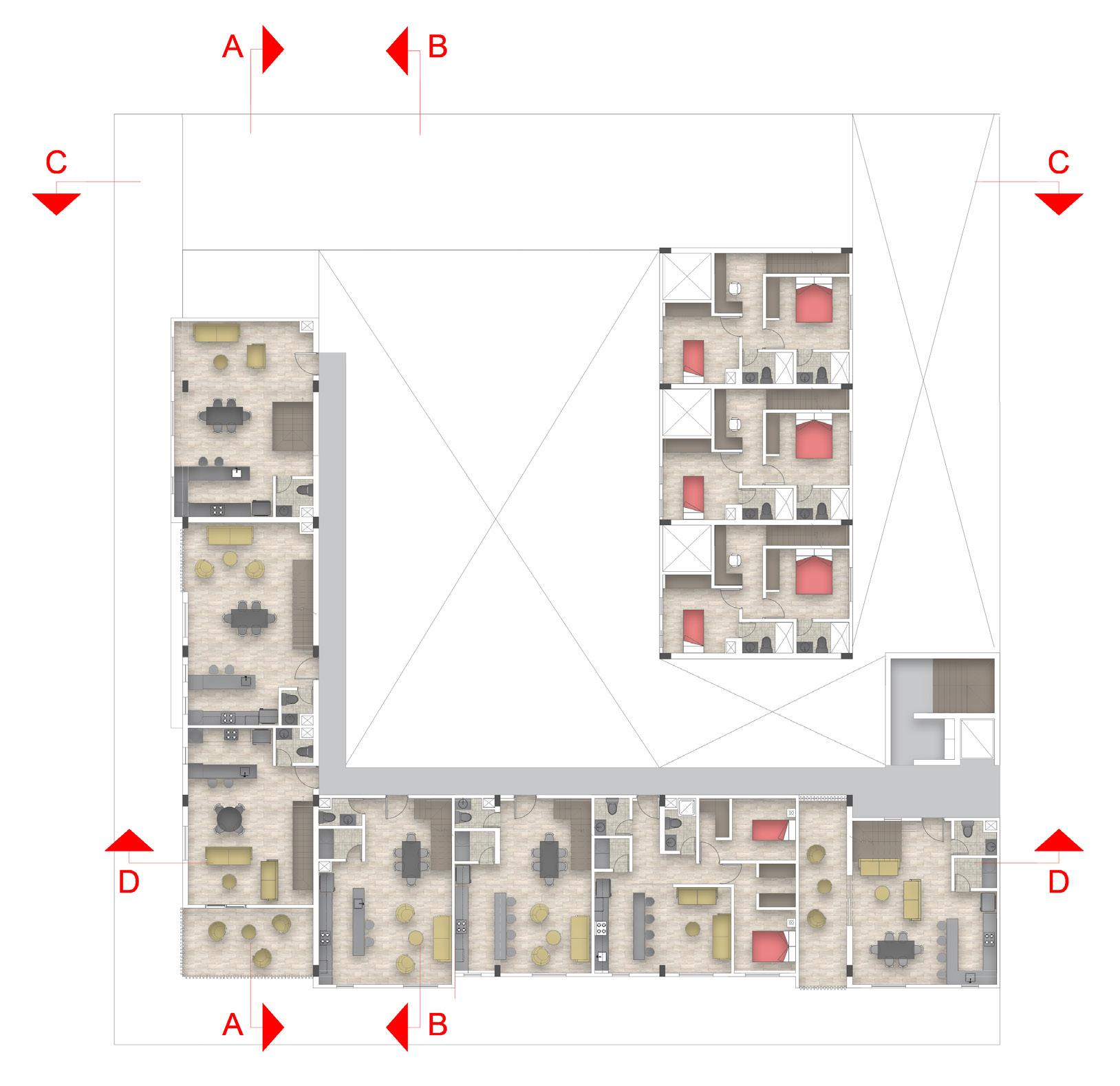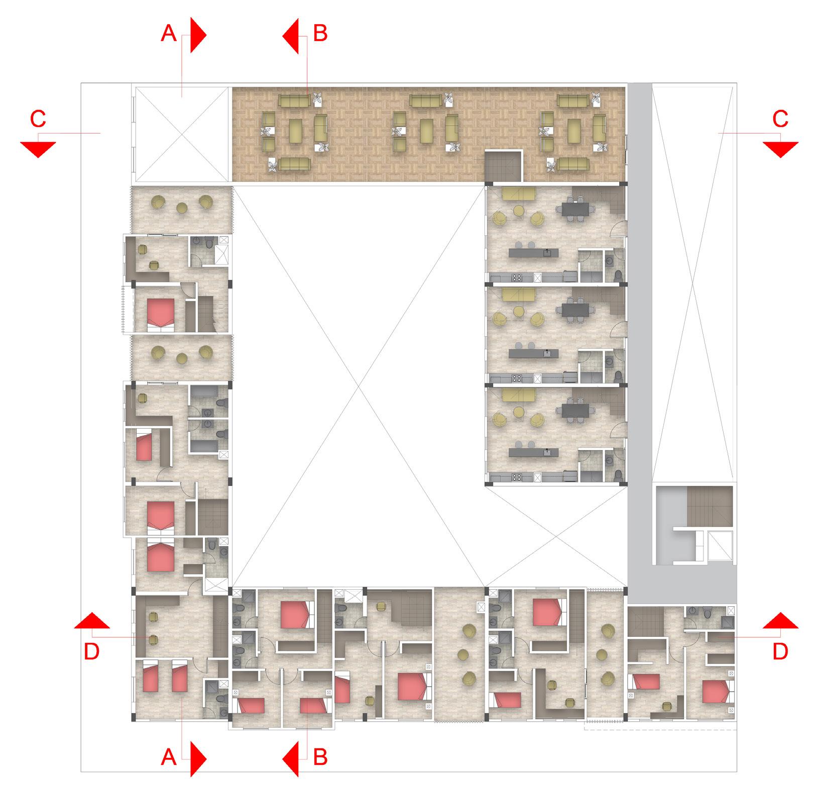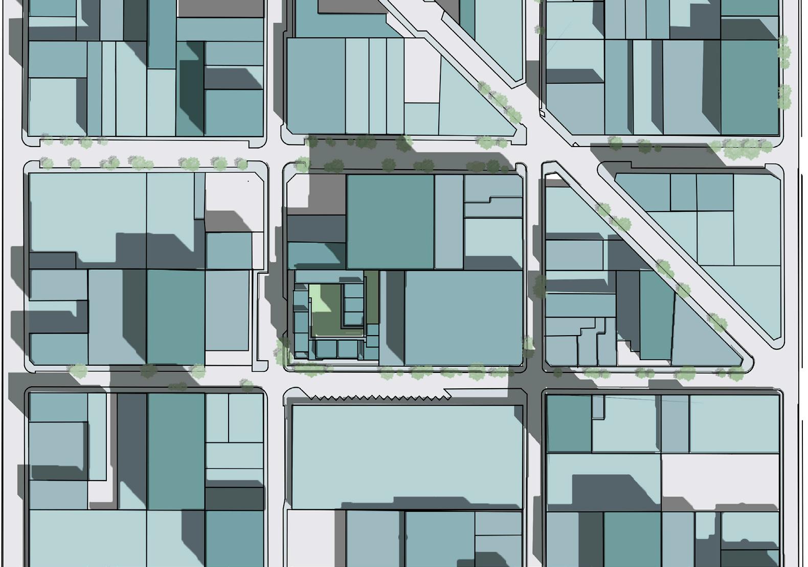 Se desarrolló un edificio híbrido, jugando con las variadas alturas de los edificios aledaños y generando espacios llamativos para el usuario.