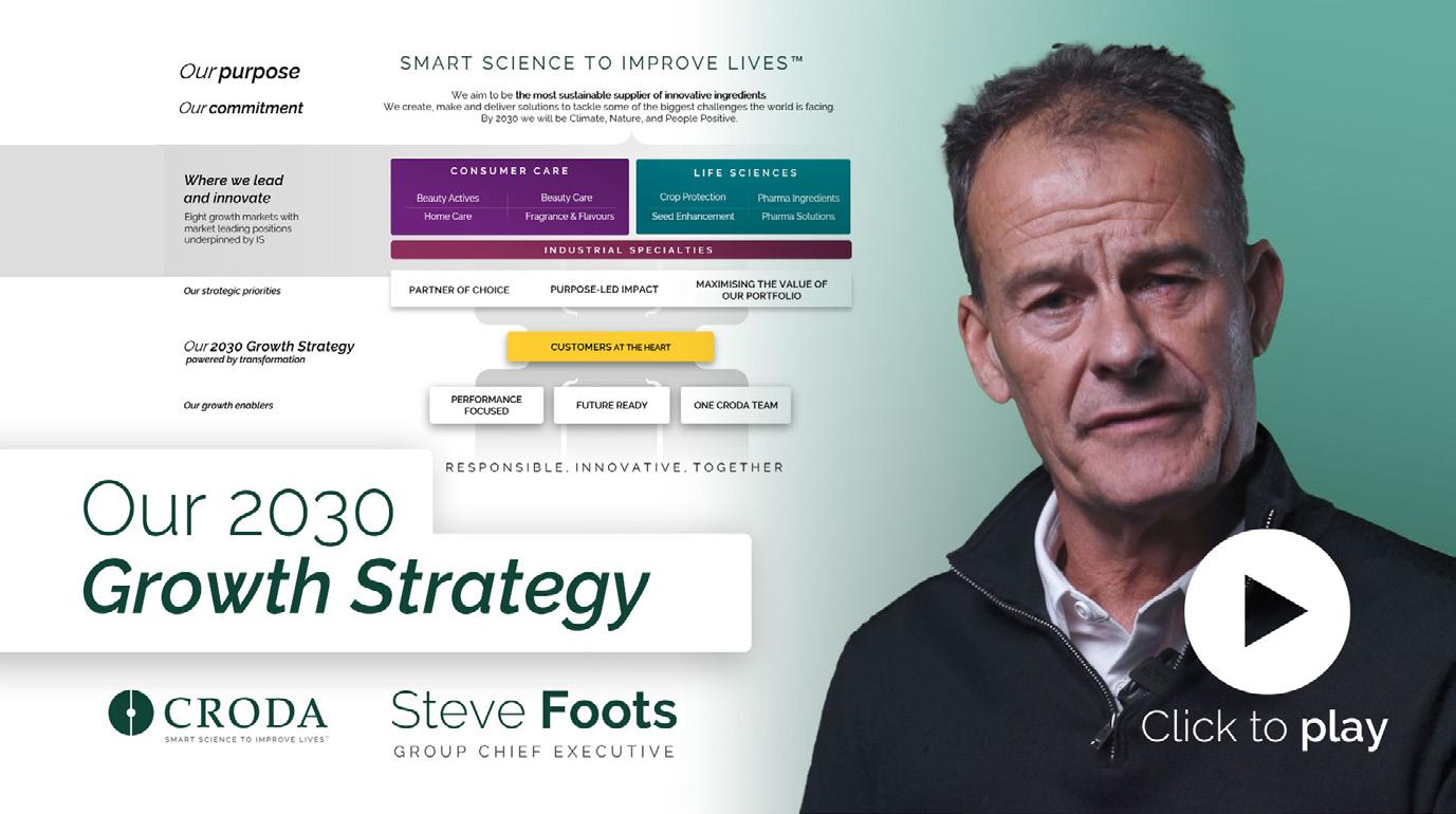Per dare forza a questa strategia, stiamo investendo in tre fattori: essere focalizzati sulla performance, mantenendo gli impegni con chiarezza e coerenza; essere pronti per il futuro, semplificando il nostro modo di lavorare, migliorando l'esperienza dei clienti e abbracciando le nuove tecnologie; operare come un unico team Croda, unito dal nostro scopo e guidato dai nostri valori.