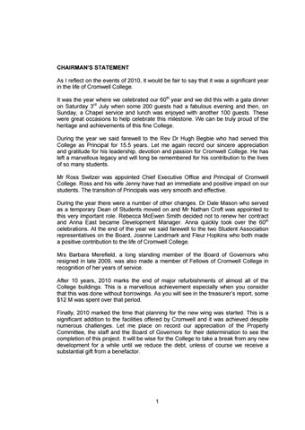 CHAIRMAN’S STATEMENT As I reflect on the events of 2010, it would be fair to say that it was a significant year in the life of Cromwell College. It was the year where we celebrated our 60th year and we did this with a gala dinner on Saturday 3rd July when some 200 guests had a fabulous evening and then, on Sunday, a Chapel service and lunch was enjoyed with another 100 guests. These were great occasions to help celebrate this milestone. We can be truly proud of the heritage and achievements of this fine College. During the year we said farewell to the Rev Dr Hugh Begbie who had served this College as Principal for 15.5 years. Let me again record our sincere appreciation and gratitude for his leadership, devotion and passion for Cromwell College. He has left a marvellous legacy and will long be remembered for his contribution to the lives of so many students. Mr Ross Switzer was appointed Chief Executive Office and Principal of Cromwell College. Ross and his wife Jenny have had an immediate and positive impact on our students. The transition of Principals was very smooth and effective. During the year there were a number of other changes. Dr Dale Mason who served as a temporary Dean of Students moved on and Mr Nathan Croft was appointed to this very important role. Rebecca McEwen Smith decided not to renew her contract and Anna East became Development Manager. Anna quickly took over the 60th celebrations. At the end of the year we said farewell to the two Student Association representatives on the Board, Joanne Landmark and Fleur Hopkins who both made a positive contribution to the life of Cromwell College. Mrs Barbara Merefield, a long standing member of the Board of Governors who resigned in late 2009, was also made a member of Fellows of Cromwell College in recognition of her years of service. After 10 years, 2010 marks the end of major refurbishments of almost all of the College buildings. This is a marvellous achievement especially when you consider that this was done without borrowings. As you will see in the treasurer’s report, some $12 M was spent over that period. Finally, 2010 marked the time that planning for the new wing was started. This is a significant addition to the facilities offered by Cromwell and it was achieved despite numerous challenges. Let me place on record our appreciation of the Property Committee, the staff and the Board of Governors for their determination to see the completion of this project. It will be wise for the College to take a break from any new development for a while until we reduce the debt, unless of course we receive a substantial gift from a benefactor.