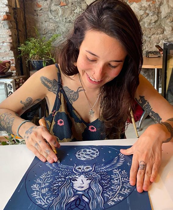 La artista gráfica Isabel Tello ha construido un ecosistema poblado por seres tallados bajo el cuchillo y el cincel: ajolotes serpenteando, armadillos acunados, libélulas flotando sobre diosas, lunas alcanzadas por la palma de una sola mujer. Sus grabados parecen extraídos de un sueño tanto como de su propio mundo interior.