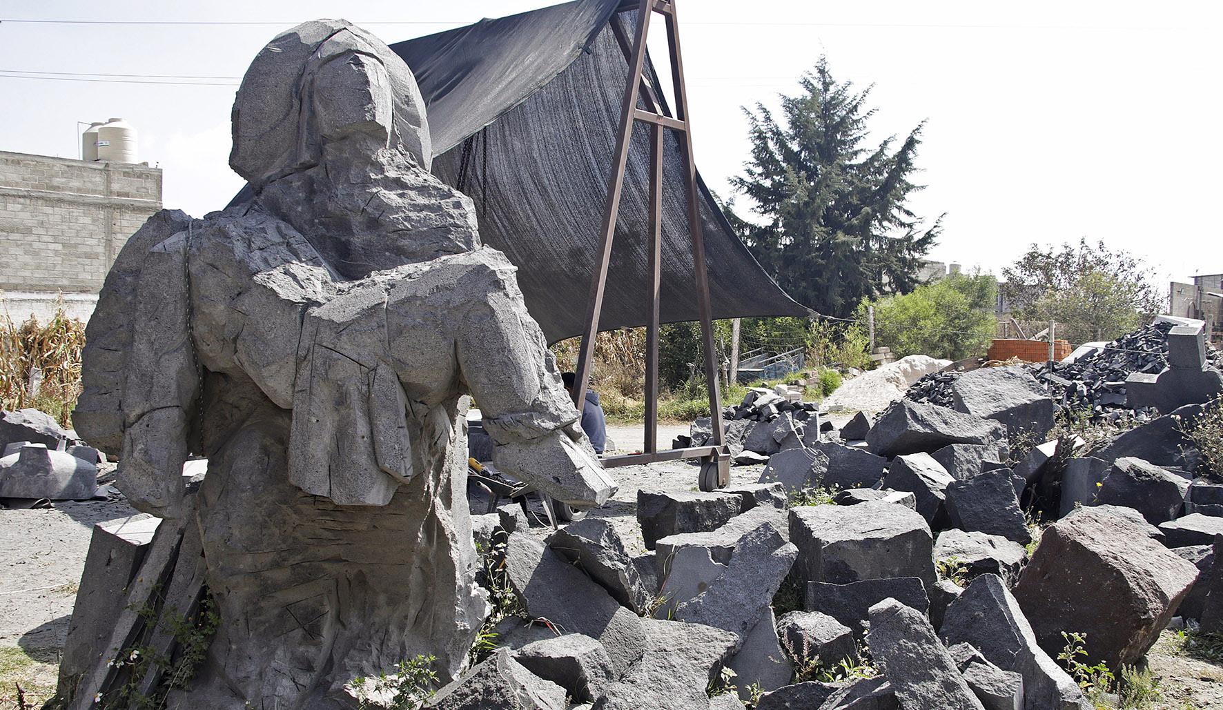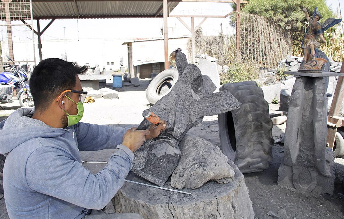 Omar Fernández explica que la piedra no se talla: se esculpe. A golpe de martillo sobre cincel se hace el detalle fino tanto en Nealtican como en los otros pueblos alrededor del Popocatépetl, fuente de su materia prima