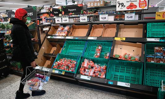 La escasez, aclaran, se debe al clima extremo en España y el norte de África que ha afectado las cosechas y que son sus principales proveedores de estos productos agrícolas. En la foto se observa las estanterías vacías en uno de estos supermercados Morrisons en la capital del Reino Unido.