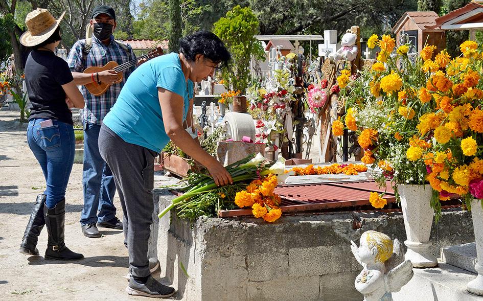 En los años 30 y 40 del siglo pasado, la costumbre poblana dictó que quienes acudieran el día de Todos los Santos y de los Fieles Difuntos al cementerio para honrar a sus seres queridos fallecidos llegaran con su vestuario más elegante. Así lo evidencia esta imagen, donde se distingue al deudo de los trabajadores y a la dama de las monjas.