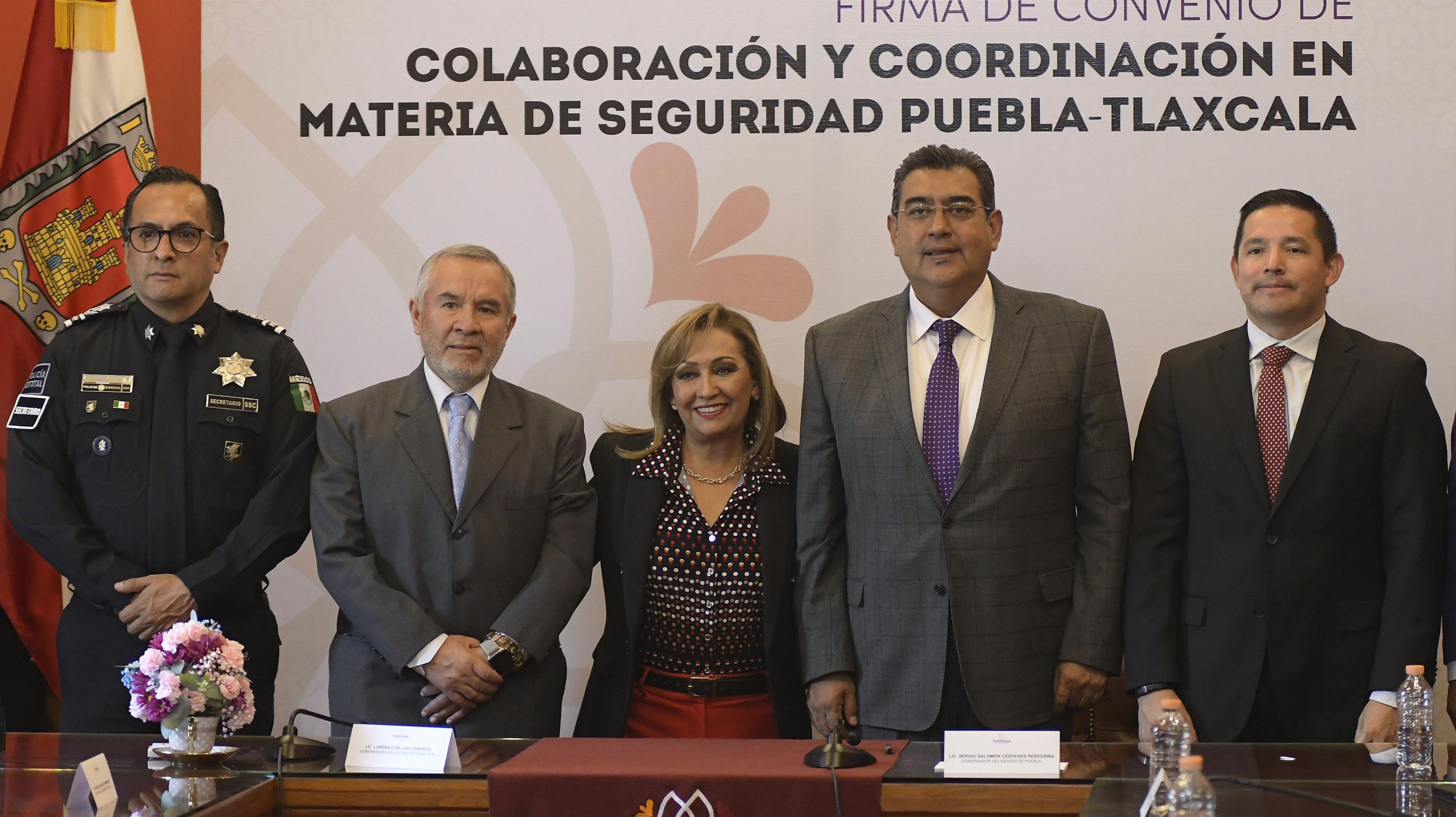 Lorena Cuéllar y Salomón Céspedes, gobernadores de Tlaxcala y Puebla, firmaron ayer un convenio para reforzar la seguridad a través del intercambio de información constante entre corporaciones de vigilancia e investigación de crímenes, con el fin de articular las estrategias de combate al crimen en las poblaciones de las dos entidades; la mandataria tlaxcalteca reconoció el trabajo de su homólogo