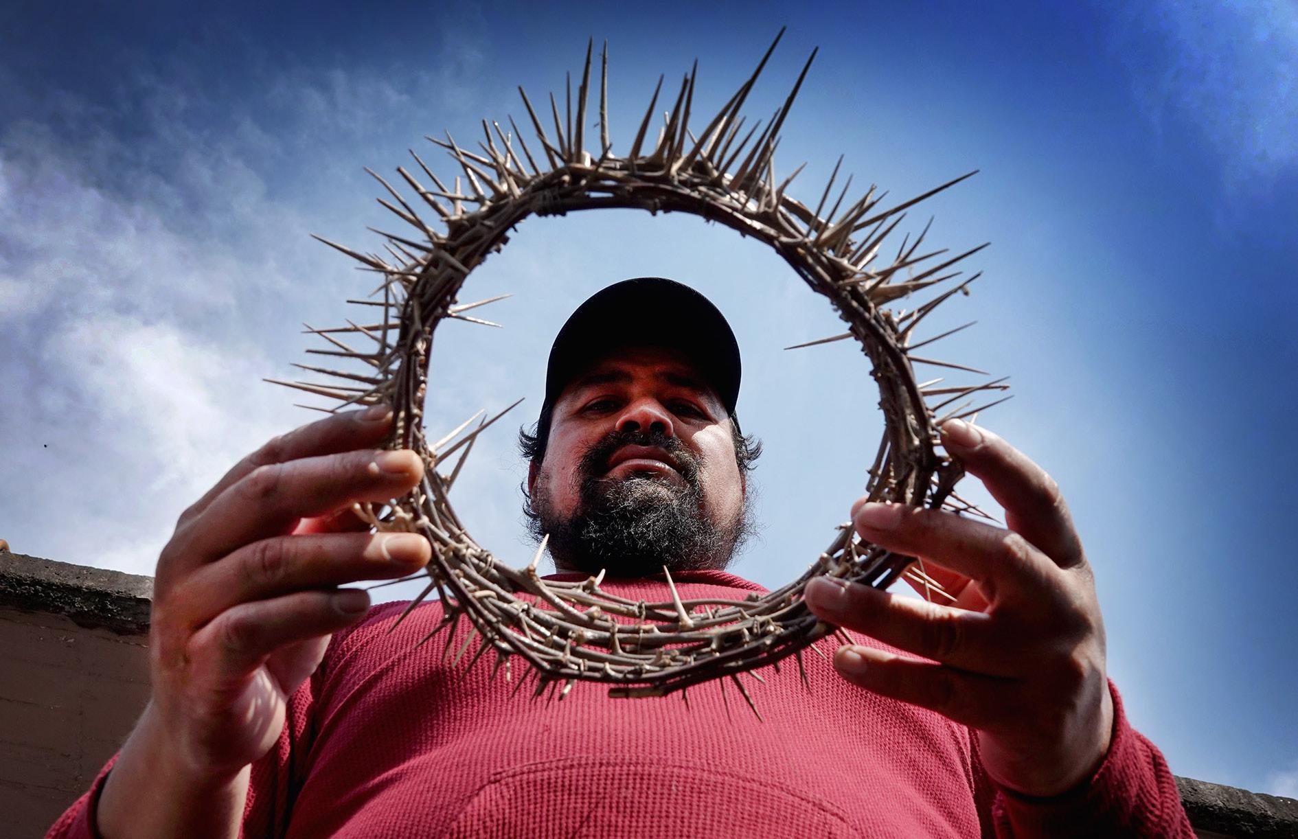 Entre los artesanos que trabajan para las representaciones de Semana Mayor, destaca el oficio de Marco Antonio Reyes. Hace el tocado de espinas para el Cristo de Iztapalapa, el más aplaudido y admirado del país. Cree que está predestinado al papel que heredó del padre y del abuelo. Y cómo no, si su segundo apellido lo dice todo: Agonizante.