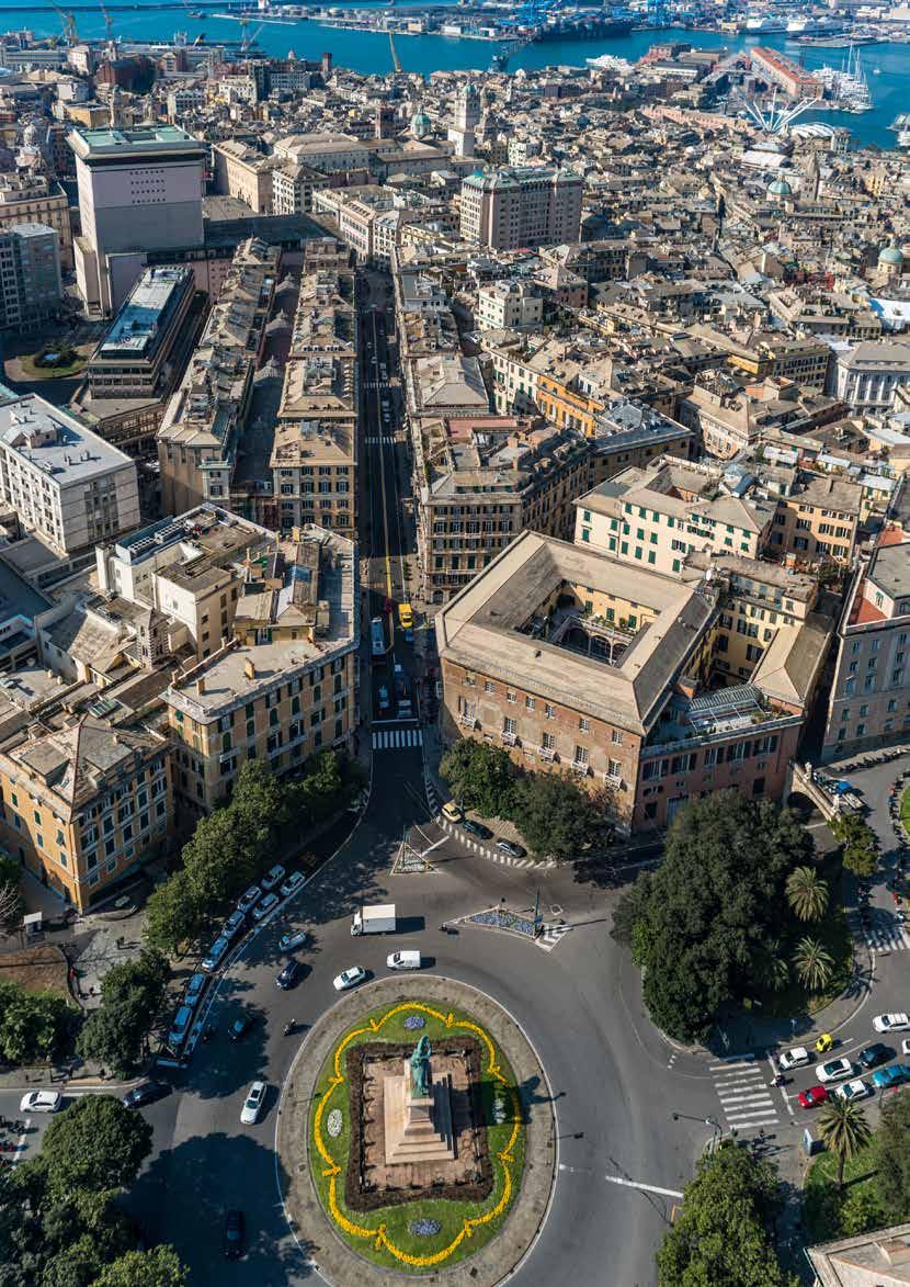 zione offrì un nucleo protetto per le prime attività marittime lungo una costa spesso aspra e priva di approdi naturali significativi. La città si sviluppò tra il mare e i rilievi montuosi, protetta da lingue di terra a est e ovest (il Molo Vecchio e il Promontorio) e cinta a nord dalle montagne, che la riparavano dai venti e dalle incursioni nemiche. Ma questi due elementi di protezione, mare e montagne, non hanno isolato Genova: al contrario, le consentirono di comunicare con le coste della penisola italiana, delle grandi isole (Corsica, Sardegna e Sicilia), della penisola iberica, fino all’Africa settentrionale. Al culmine della sua potenza, Genova estese la sua rete fino al Mar Nero a oriente e all’Atlantico a occidente. Con l’apertura del Canale di Suez, nel 1869, si spalancarono anche le rotte verso l’Estremo Oriente.
