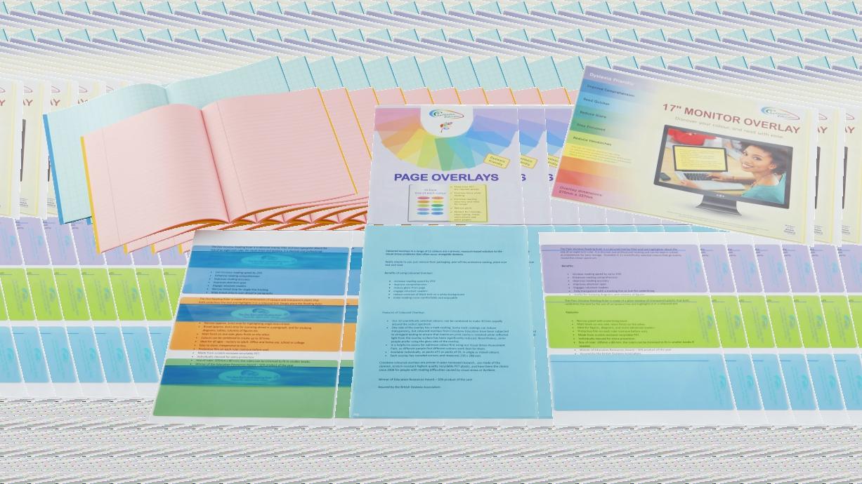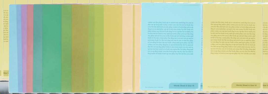 Each section on this 2 page spread shows one of our 10 colours in the Visual Stress range. Is one of them more comfortable for you?