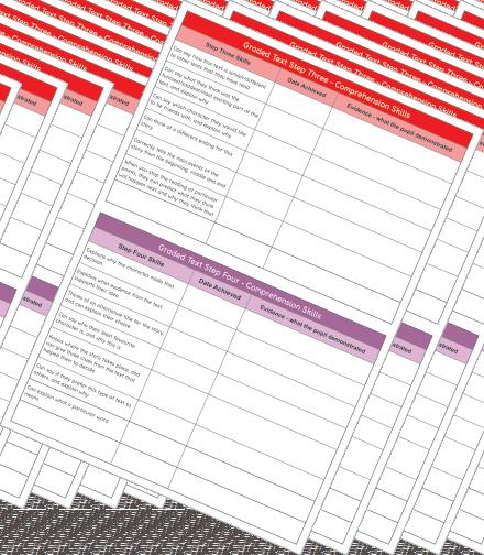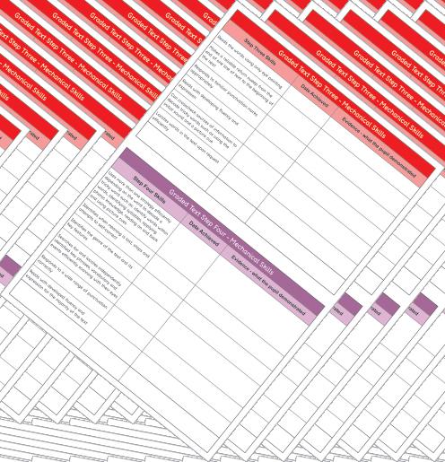 Ÿ Using the color-coded chart supplied, identify which card to use with the pupil. Each card is matched to one of six text steps – graded by difficulty.