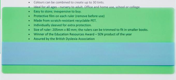 3) All our overlays and reading rulers also have a scratch-resistant coating as well as a peel-off protective layer. In addition, PET is a harder plastic than PVC. Most surface damage to overlays, especially the softer PVC ones, occurs when they are scraped across desks and tables, which inevitably happens in everyday use. Our products are designed specifically to withstand this.