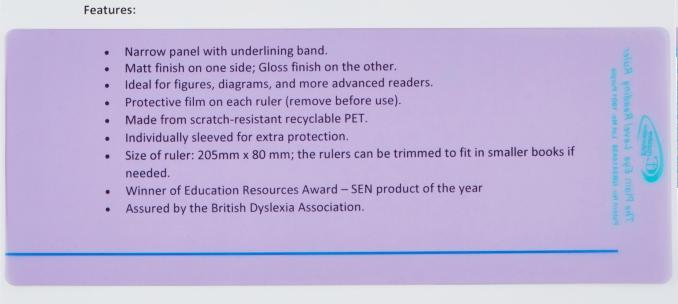 6) We are experts, founded in the UK by an SEN teacher in 1993, and we know about the visual difficulties that often come with dyslexia (and without it too.) We designed the original Eye Level Reading Ruler back in 2004. We don't sell twig lights, pharmaceuticals, plumbing accessories, or seafood tools, which are among the non-educational materials sold by other vendors who just see reading difficulties as another market they can profit from.