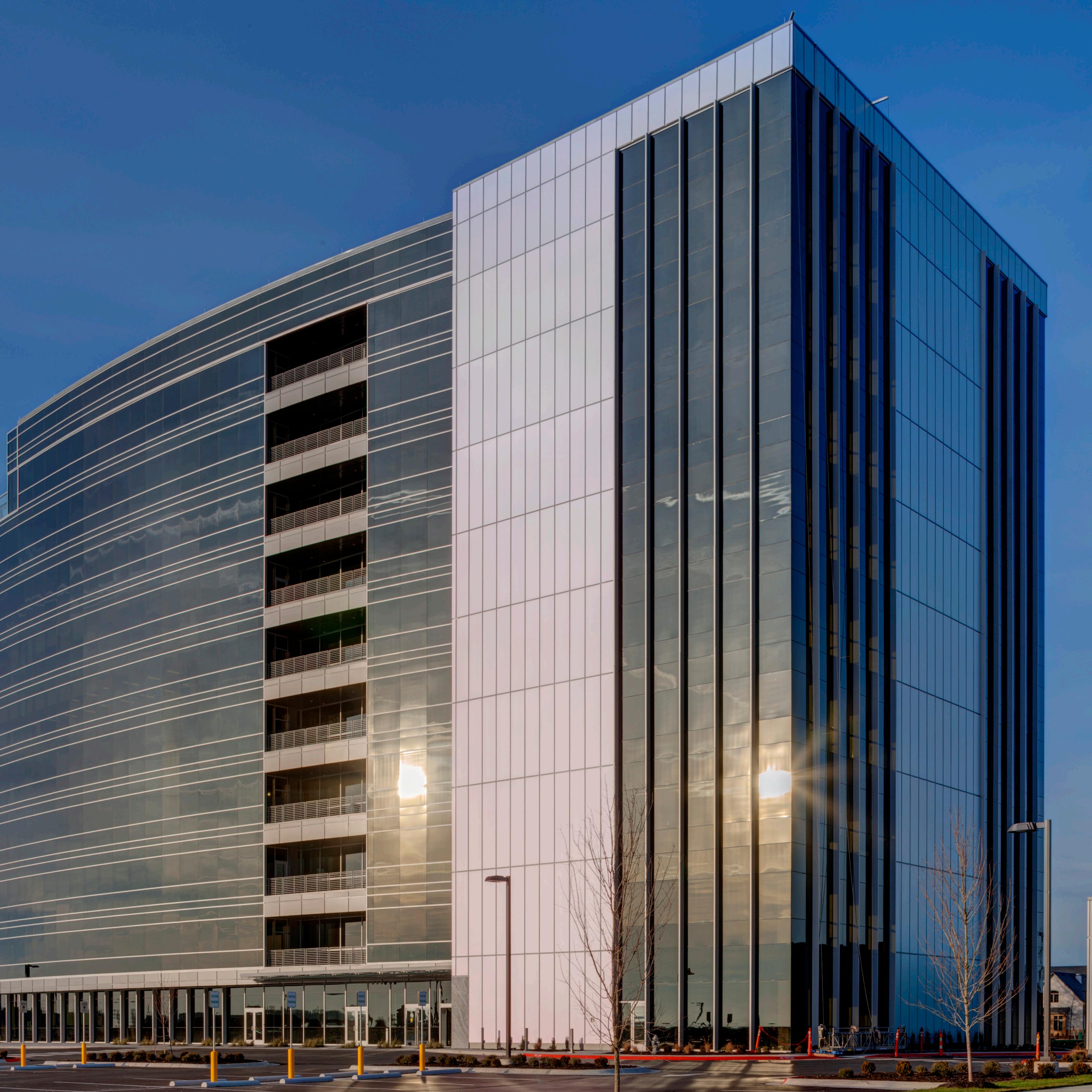 The architecture of Founders Plaza features a sophisticated blend of aluminum metal panels, curtain walls, storefronts,