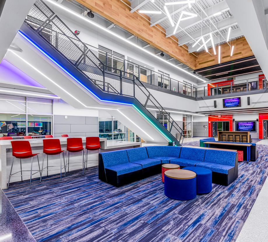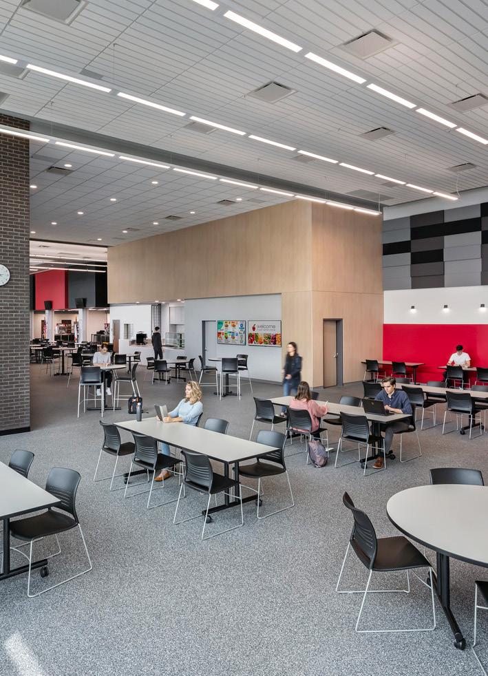 The gym addition was designed to include a full basketball court with additional basketball courts, creating a space that could also be used for volleyball. In addition, the new facility boasts telescopic bleachers, scoreboards, two locker rooms, and multiple coach offices. The café was completely renovated, with decorative wall paneling, a curtain wall, special flooring, and a coffee bar with additional kitchen equipment.