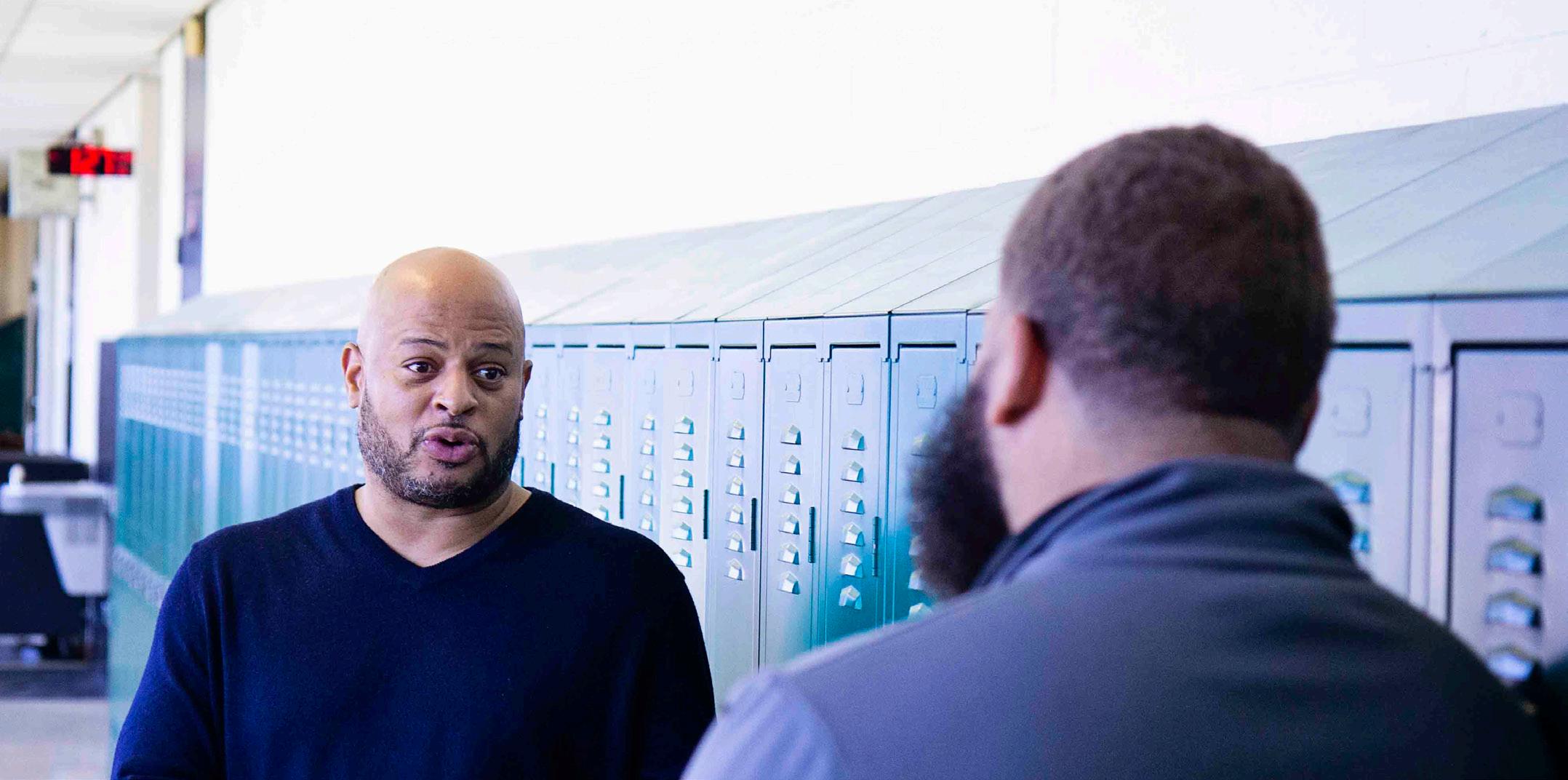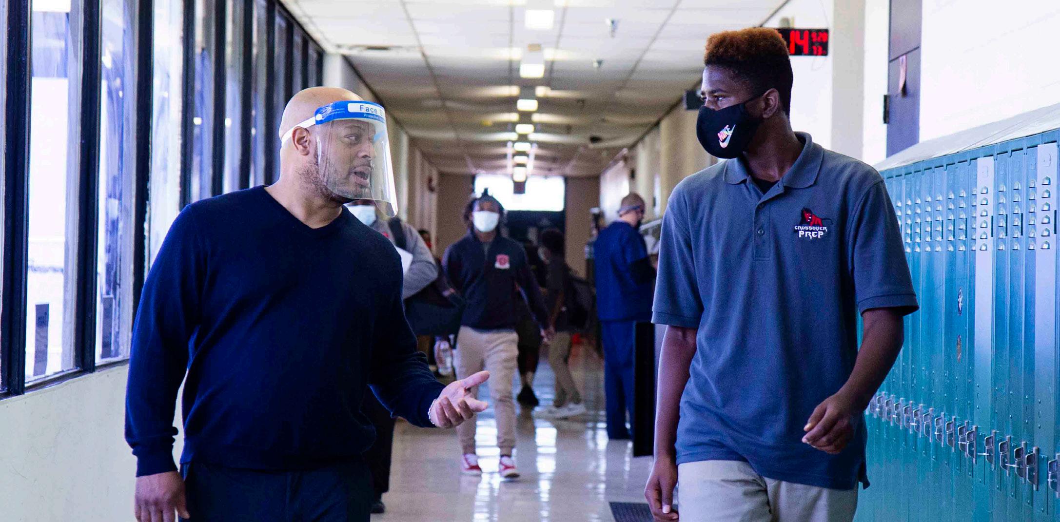 Hill encouraging a Crossover Prep student; Picture Right: Mr . Hill engaging with Mr. Taylor.