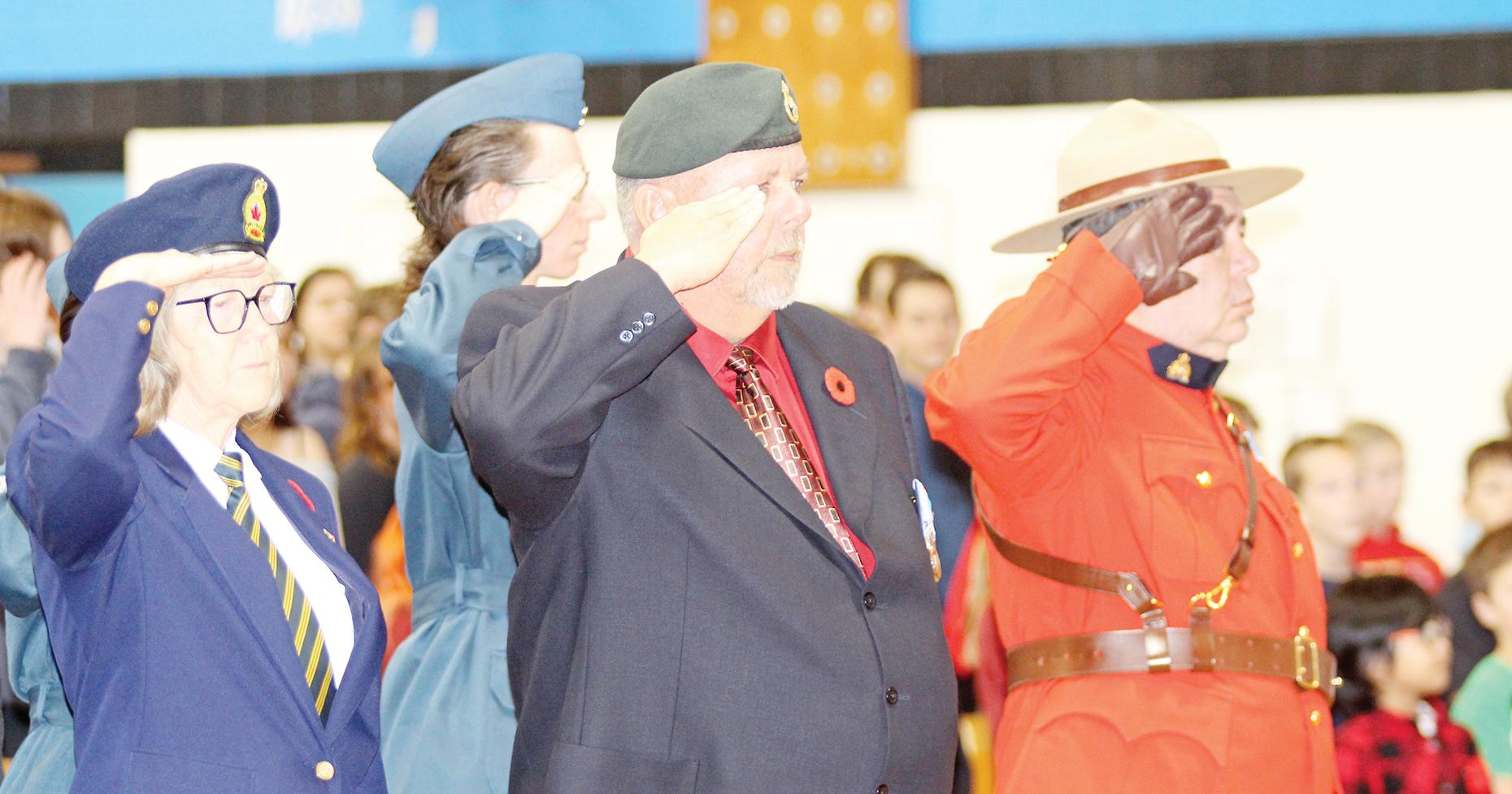 Chaplain Wendy Thom of the Shoal Lake Legion, Master Warrant Officer Paul Lucas (Retired) and RCMP Sergeant Richard Marshall (Retired), from left, were among the dignitaries recognized at the Shoal Lake School’s Remembrance Day Service on Monday, Nov. 10. The ceremony honoured veterans and fallen soldiers through skits, songs, poems, and included two minutes of silence.