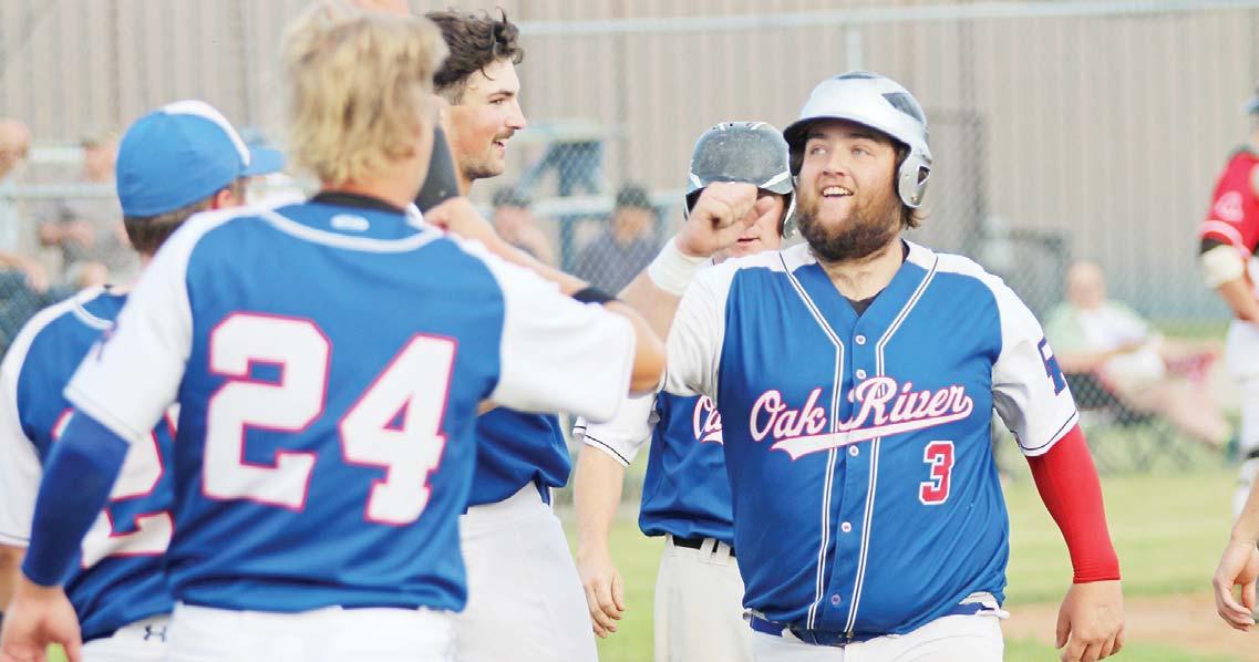 Chase Anderson (#3) proved his prowess on the diamond, as the first baseman of the Oak River Dodgers was congratulated by teammates after belting a two run homer against the Hamiota Red Sox in Oak River on Sunday, July 13. Kaden Rozdeba also had a hot bat recording a three-run home run to erase a 6-5 deficit, allowing the Dodgers to post a 8-7 win and claim the South West Baseball League playoff series 2-1.