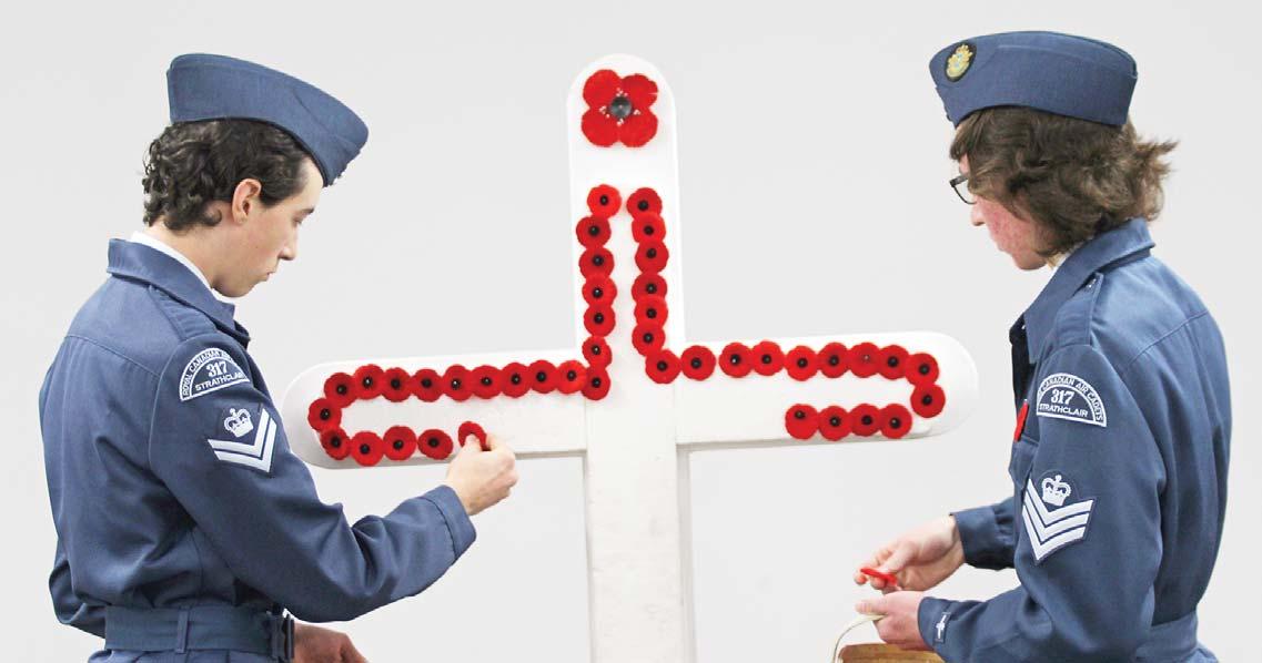 Torrin Smith, left, and Colby Tataryn, of the 317 Strathclair RCAC Squadron had the honour of pinning a poppy on the cross for each name of a World War I and II veteran read out by Legion members Jim Kennedy and Dick Edgeworth at the Shoal Lake Remembrance Day Service on Monday, Nov. 11. Citizens took a moment to salute these soldiers, as they must not be forgotten for giving their lives for our freedom.