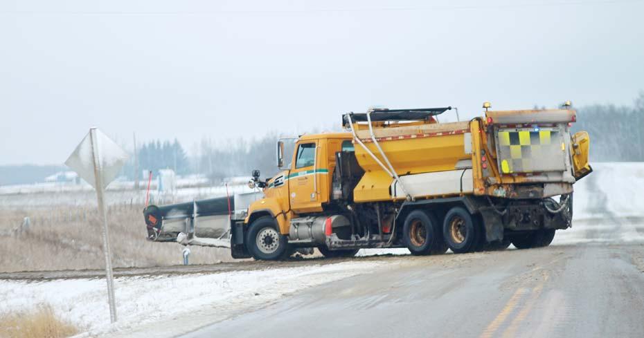 Sounds of Manitoba Transportation and Infrastructure equipment broke the silence of Sunday morning, Nov. 17, as road salt was required on all major highways inthe area. Here, a truck laden with slush covered wing plows turned into the Shoal Lake yard, as the battle of clearing ice continued throughout the day. The scene was much the same mid-week, as rain turned into snow as temperatures dropped, creating hazardous driving conditions.