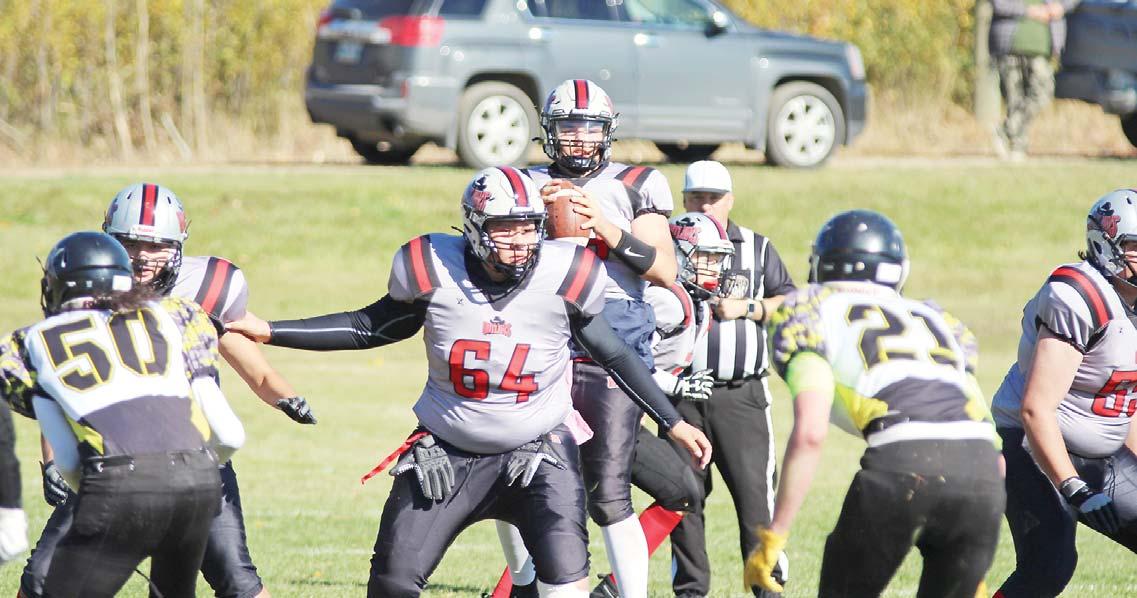 Park West Outlaws quarterback Lucas Cook takes a look for an open receiver during play against the Moosomin Generals at Waddell Field in Shoal Lake on Sunday, Oct. 6. Losing to Moosomin 55-0, the Outlaws dropped to 1-4 on the season. The Dauphin Clippers doubled the undefeated Swan Valley Tigers 28-14 to move into a first-place tie with the