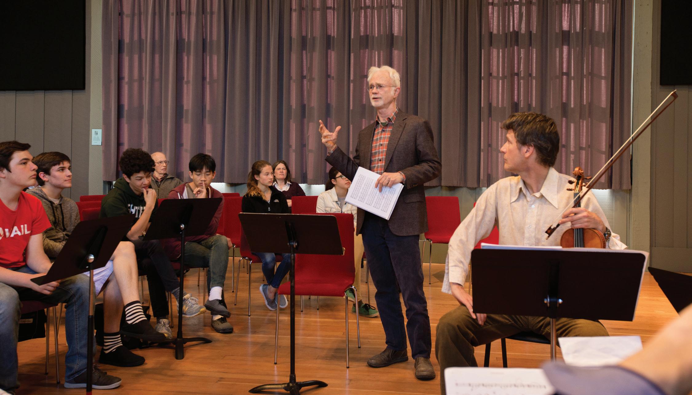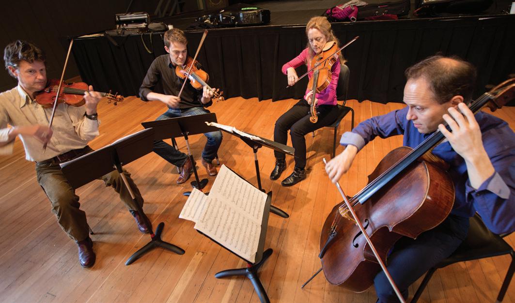 a half, the SLSQ players (including Crowden School alumnus Owen Dalby on second violin) pursued perfection, taking advantage of the composer’s presence with nuanced questions, determinedly dissecting the work’s challenges to its performers. “I spend a lot of time working and conducting orchestra,” marveled John Adams. “If you’re lucky you get three hours. You NEVER get something at the level of this [performance] right now—they’ve played it so often, they’re really an organism. It’s really satisfying.” Mr. Adams provided insights into the work being rehearsed, and shared thoughtprovoking and often very funny anecdotes both from his own career and music history. He often paused to give advice to the students in his namesake program: “I’d say to the composers, stay away from octaves when writing for string quartet,” he quipped, while jotting down a quick note about a note in the score.
