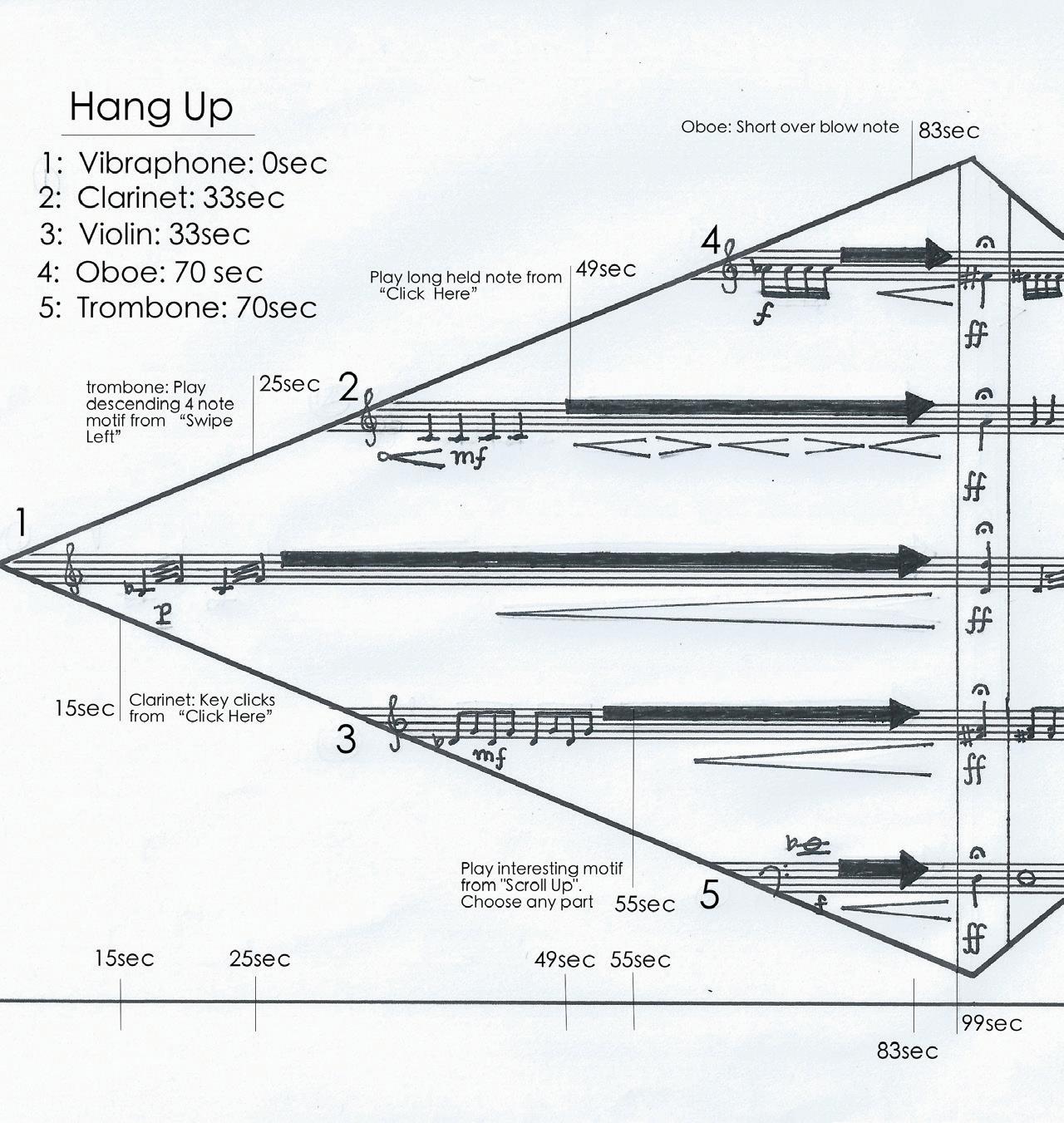 Crowden School graduate Theo Haber composed a cellphone suite for arrangements of violin, trombone, vibraphone, clarinet, oboe, and yes, cellphones. With the goal to “hopefully eliminate the blandly repetitive and robotically monotonous aspect,” Theo created a series of miniatures, with titles that cannily depict the most basic ways one repetitively operates a cell phone (pick up, scroll up, click here, etc.).