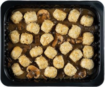 A blend of beef and a mixture of seasonings formed and baked topped with a savory Demi-Glace style sauce with mushrooms, trayed with creamy real mashed potatoes.