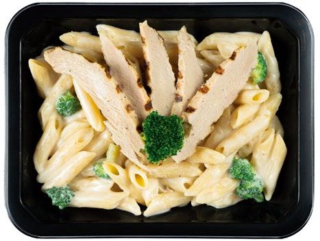 Penne pasta tossed in our creamy parmesan alfredo sauce trayed with strips of open flame grilled chicken and steamed broccoli.