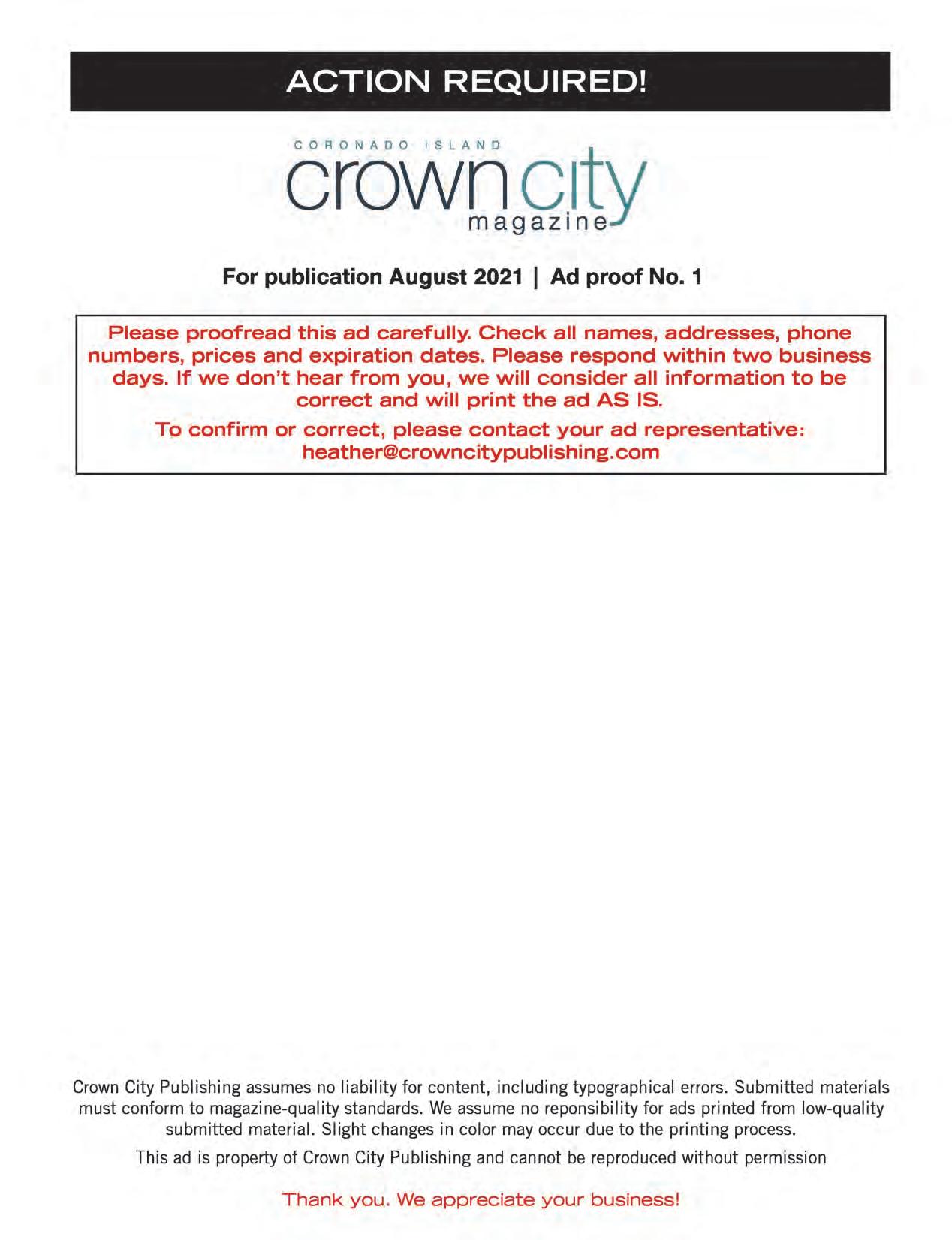 confirm or correct, please contact your ad representative: heather@crowncitypublishing.com alex@crowncitypublishing.com natalie@crowncitypublishing.com
