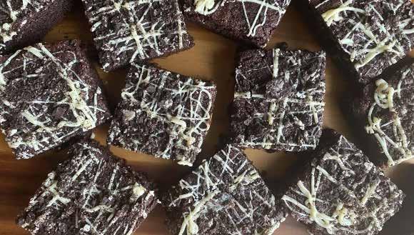 5. Drizzle chocolate on top of cooled brownies. Then add the crushed cookies.