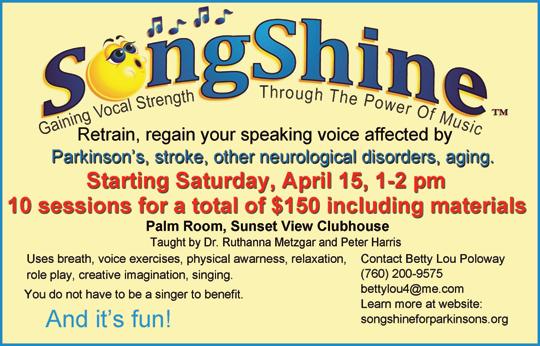 If you are interested in participating in either option, please contact Sun City SongShine President Betty Lou Poloway at bettylou4@me.com or call 760-200-9575.