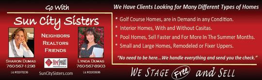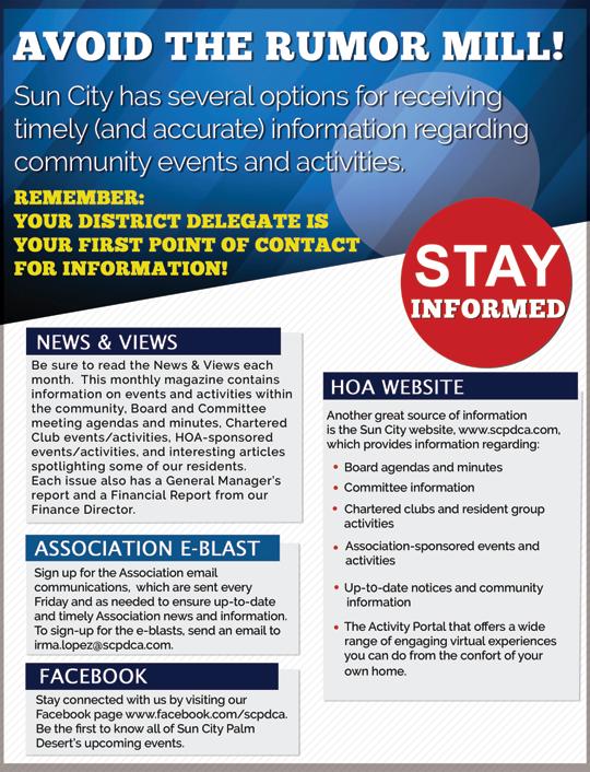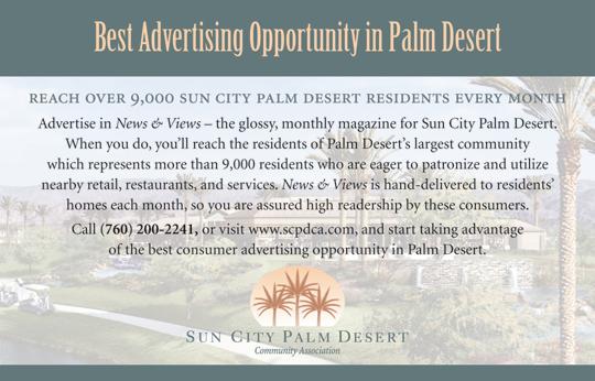 To advertise in News & Views, call (760) 200-2241 or email Irma.Lopez@scpdca.com for current rates and information. Please send News & Views comments or suggestions to the Editor at suncity92211@gmail.com.