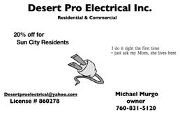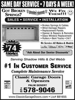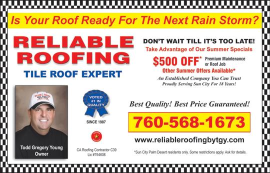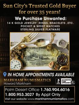 1. Sun City Palm Desert Community Association reserves the right to refuse any ad for any reason. All ads are subject to approval by the Sun City Palm Desert Community Association. 2. Sun City Palm Desert Community Association does not guarantee any work or claims made by advertisers. Publication does not constitute an endorsement or approval of goods or services advertised herein by Sun City Palm Desert Community Association.