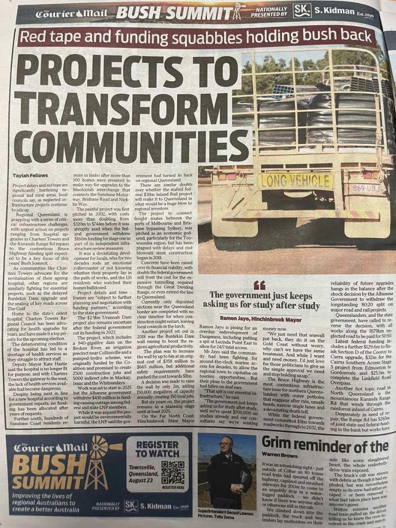 On the first of August, the Acting CEO, Deputy Mayor Evans, and I had our regional roads group and FNQROC meeting. In the roads group meeting, there was a lot of discussion on the state of the roads in the far north region, with a lot of frustration levelled at TMR for their floundering, bumbling lack of understanding of how important the Kuranda Range is to us, along with the Barron River bridge and the Gilbert River bridge staying open. It’s my opinion that TMR has been asleep at the wheel for decades, and they don’t seem to have any forward-thinking plans to get through the billion-dollar backlog of road and bridge work in our region – and that was before Cyclones Jasper and Kirrily and the subsequent flooding that devastated the far north and gulf country.