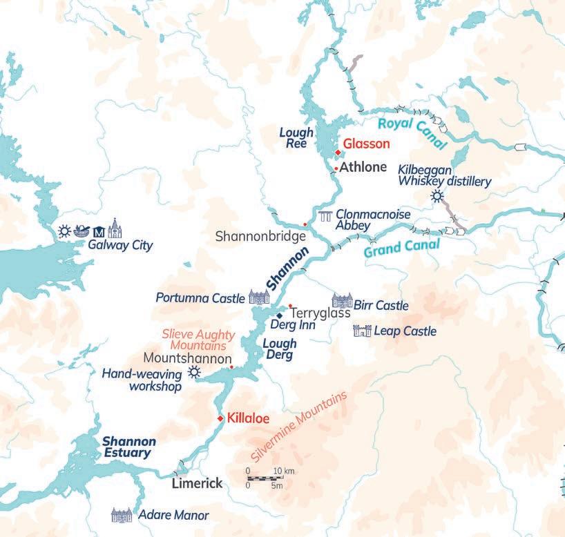 Today, our tour encompasses both the walled gardens of Portumna Castle and the lively centre of Galway city before lunch at a traditional Guinness & Oyster pub. This afternoon with cruise across Lough Derg to moor at Mountshannon. Dinner on board.