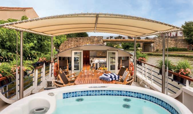 In the saloon and dining areas of your hotel barge, you will see that traditional features such as African hardwood panelling, antique furniture and period lighting are complemented by more modern features such as hand-woven rugs and beautiful banquette seating – along with expected creature comforts such as air-conditioning and central heating. There is Wi-Fi on board, a sound system, a selection of books and games, and on some barges – a TV/DVD player in the saloon or within the cabins. Most of the barges have a sensational deck-top spa pool, and sun-loungers to sit back and admire the passing countryside and villages. If you require a refreshment, our hosts will be on hand to whip up the perfect beverage. Or, if you’d prefer, you’re more than welcome to help yourself to our fully-stocked open bar featuring high-end alcoholic or soft drinks for whenever you please.