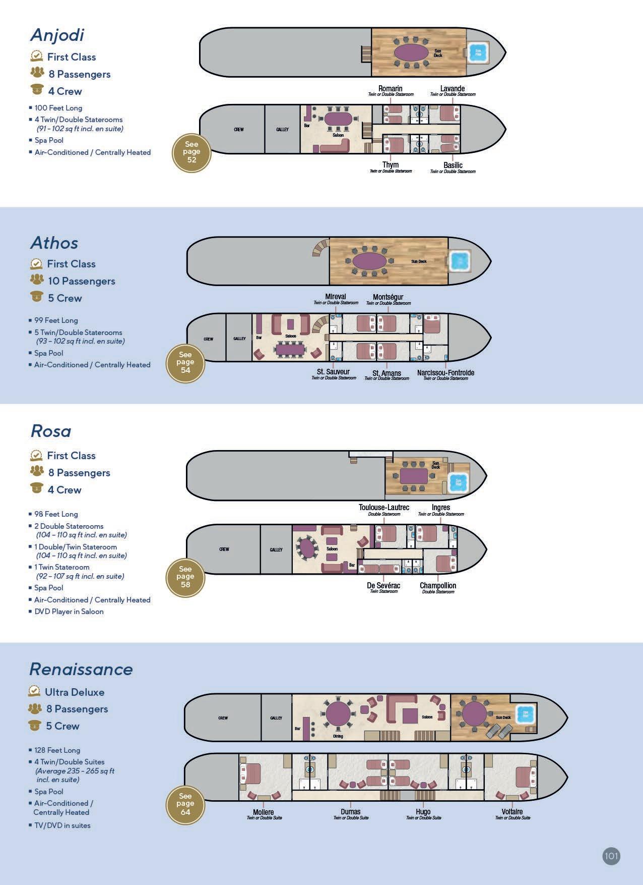 The accommodation on each barge ranges from compact and charming twin or double Staterooms to more spacious Suites. Irrespective of size, every Suite or Stateroom is skilfully designed to make optimum use of space, and features