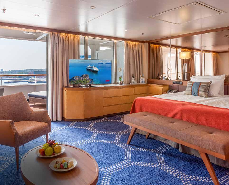 When the VASCO DA GAMA sets sail for the most beautiful destinations in the world, on-board quality and comfort will be your constant companions. You will have a choice of spacious cabins and suites measuring between 16 and 102 m2 and there are no fewer than seven individually designed bars and lounges, five restaurants, a chic wellness area with sauna and steam bath, and a large fitness centre and sports area … What more could you possibly need?