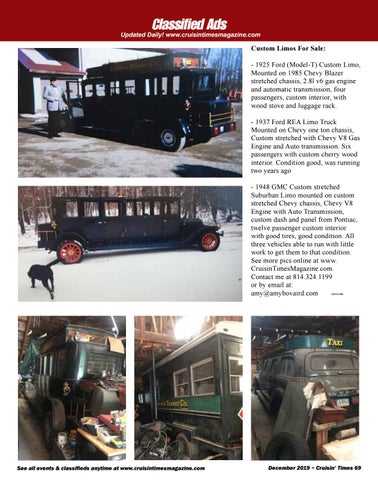 Custom Limos For Sale: - 1925 Ford (Model-T) Custom Limo, Mounted on 1985 Chevy Blazer stretched chassis, 2.8l v6 gas engine and automatic transmission, four passengers, custom interior, with wood stove and luggage rack. - 1937 Ford REA Limo Truck Mounted on Chevy one ton chassis, Custom stretched with Chevy V8 Gas Engine and Auto transmission. Six passengers with custom cherry wood interior. Condition good, was running two years ago - 1948 GMC Custom stretched Suburban Limo mounted on custom stretched Chevy chassis, Chevy V8 Engine with Auto Transmission, custom dash and panel from Pontiac, twelve passenger custom interior with good tires, good condition. All three vehicles able to run with little work to get them to that condition. See more pics online at www. CruisinTimesMagazine.com. Contact me at 814.324.1199 or by email at: amy@amybovaird.com 1019111900